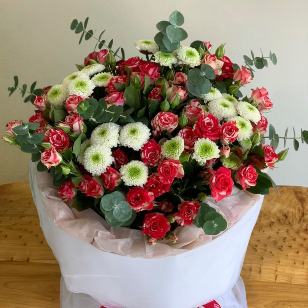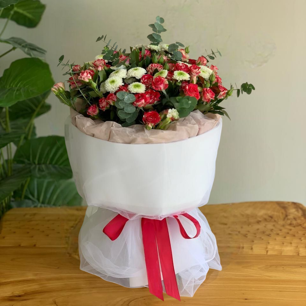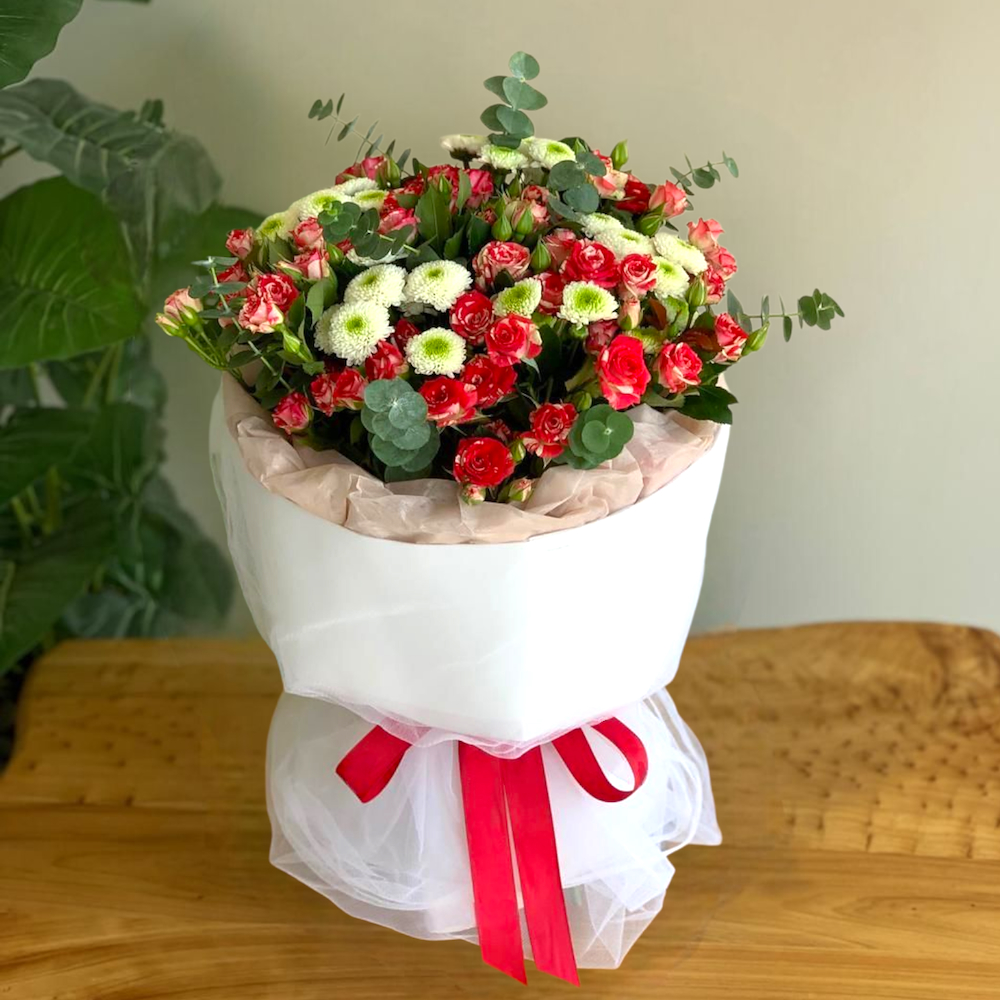 A bouquet featuring baby roses with Dutch chrysanthemum flowers.