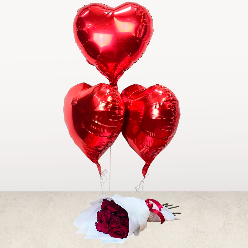 A bouquet that contains roses along with balloons.