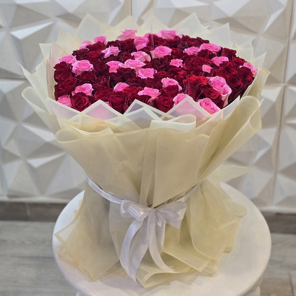 A large bouquet in a sponge base containing 70 red baby roses and 30 pink baby roses in a beautiful arrangement.