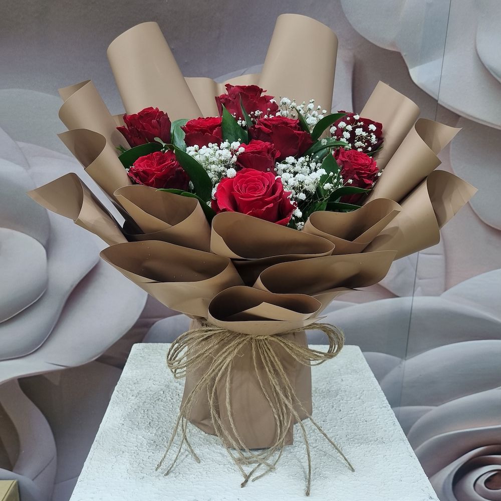 This hand bouquet contains roses, gypsophila, and ruscus stems.