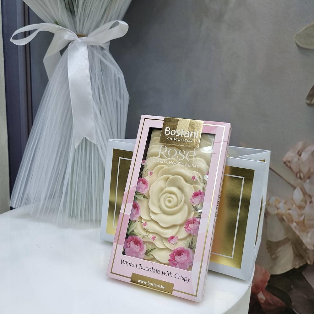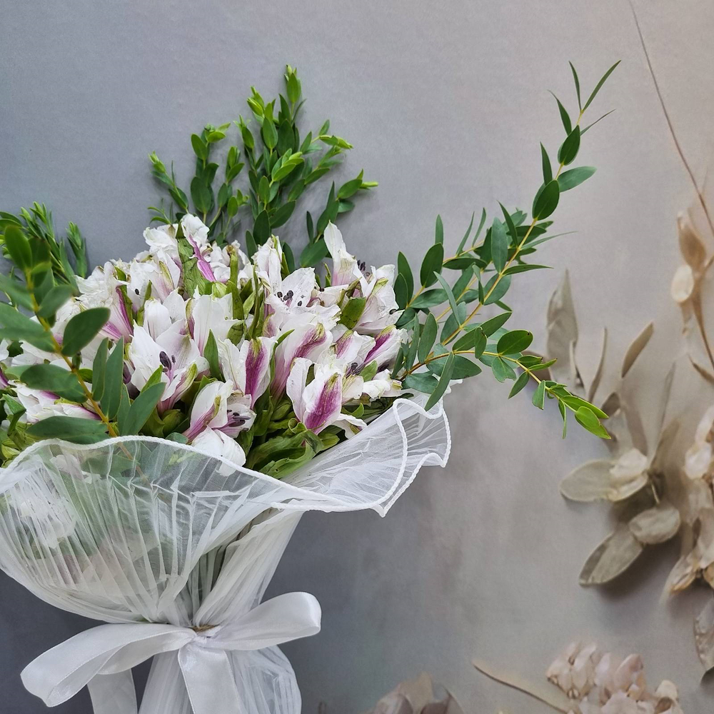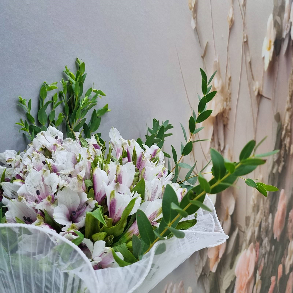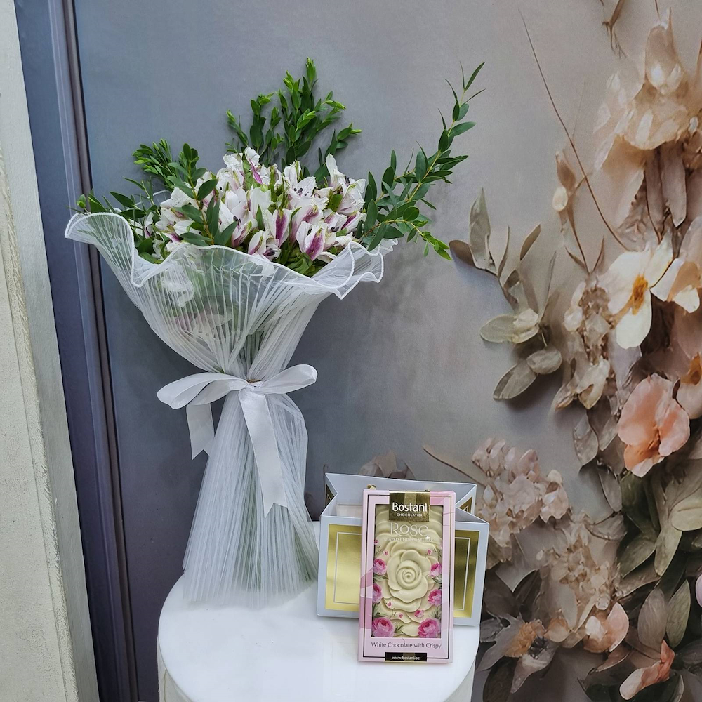 A vase filled with alstroemeria and eucalyptus with Bostani chocolates.
