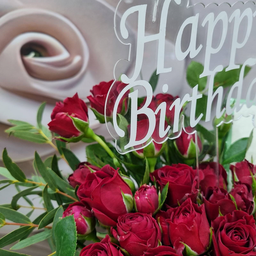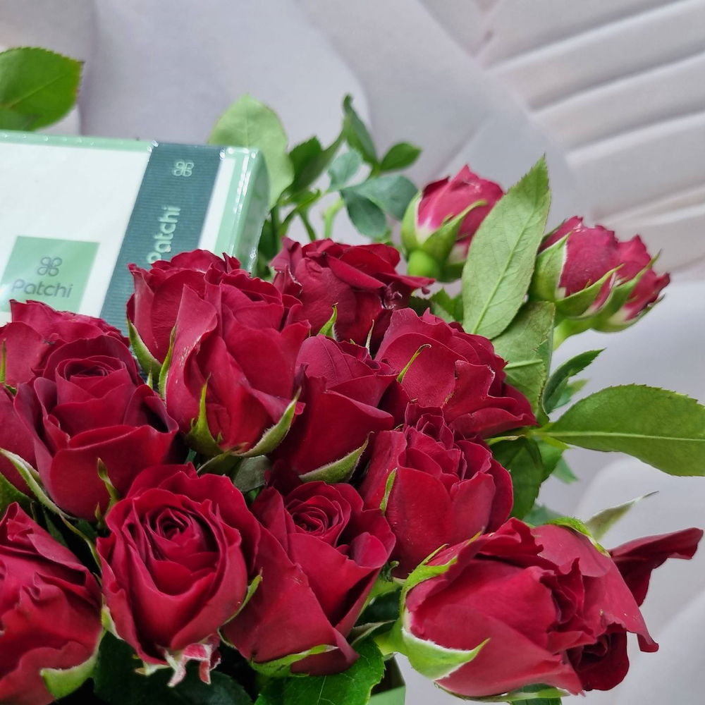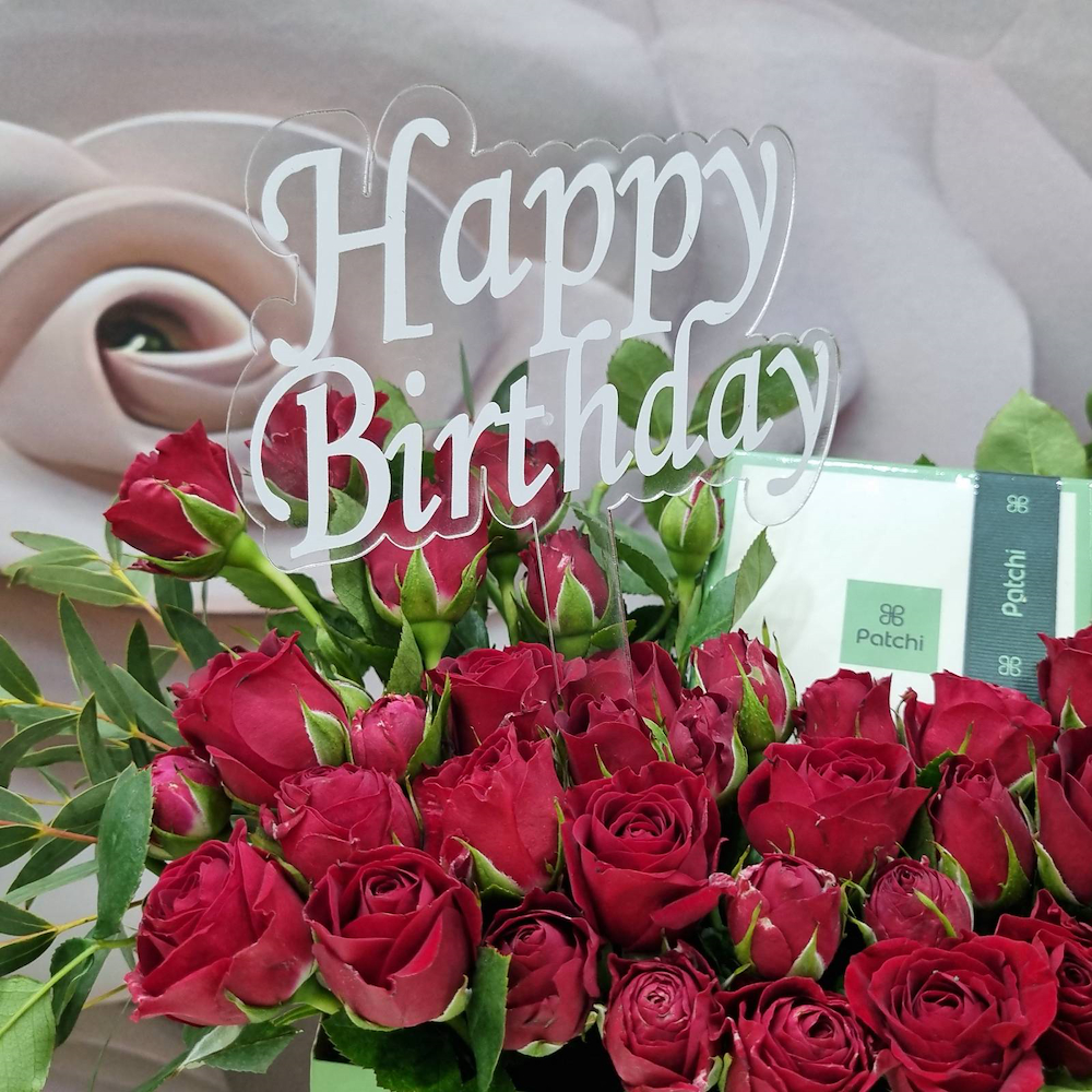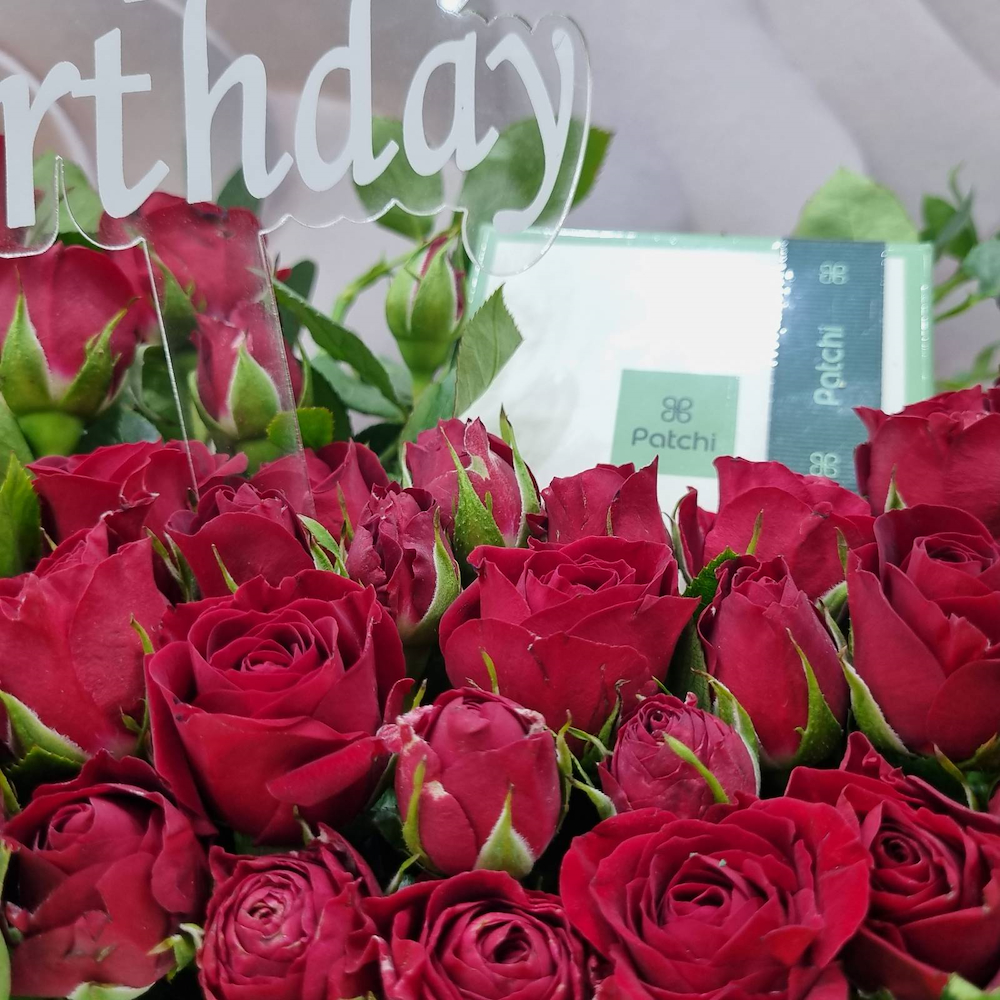 A bag filled with red baby roses with a birthday topper, and Patchi chocolates.