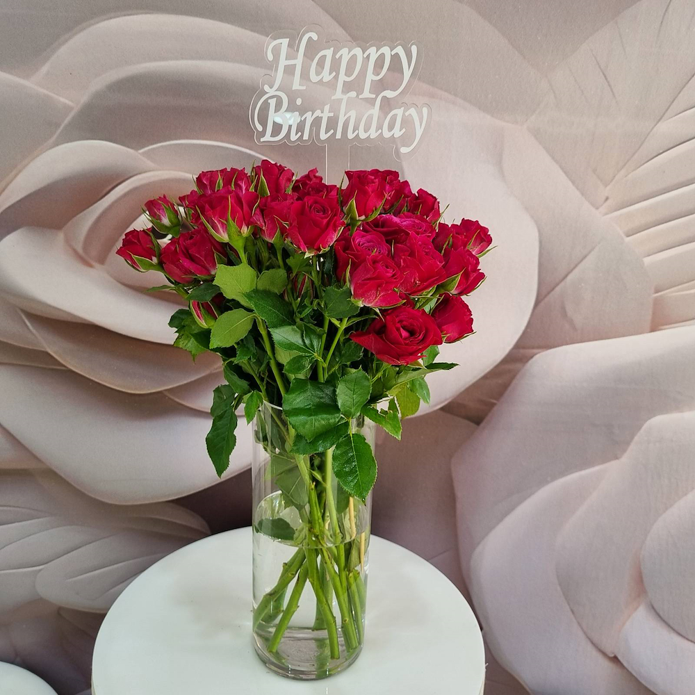 A vase filled with red baby roses with a birthday topper.