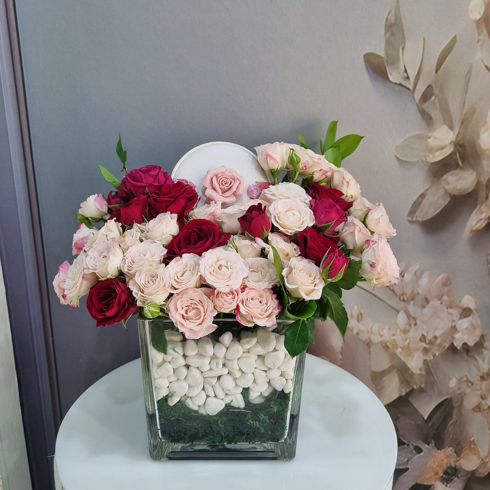 A vase filled with baby roses with Bostani chocolates.