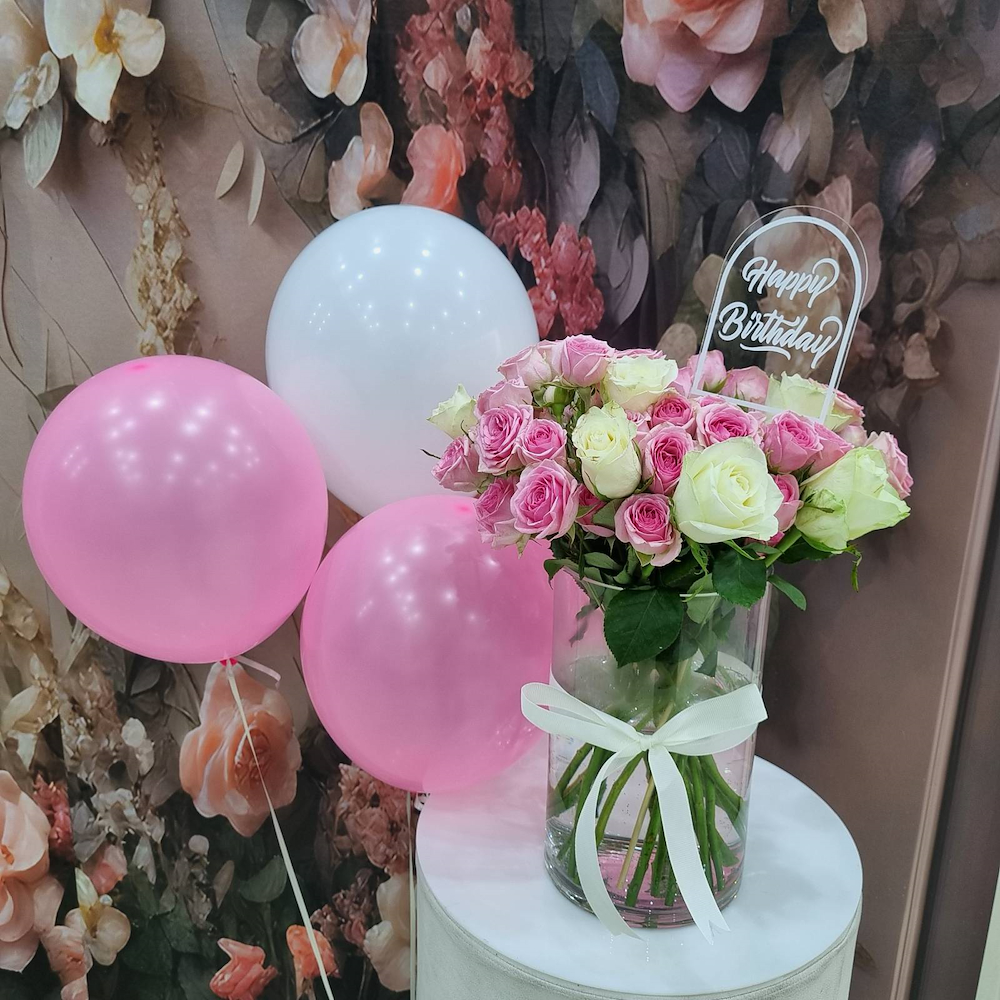 A vase featuring roses and baby roses with balloons and acrylic topper.