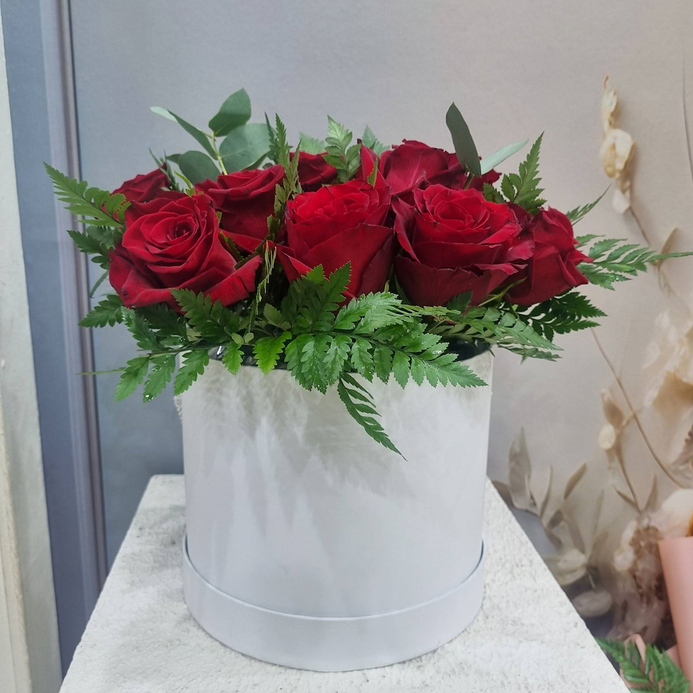 The gift contains red roses and leather leaves.