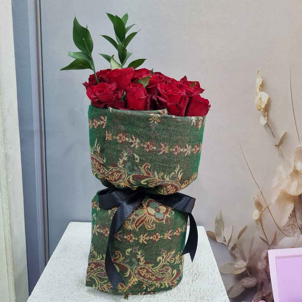 The bouquet contains 15 red roses with ruscus leaves in elegant cashmere wrapping.
