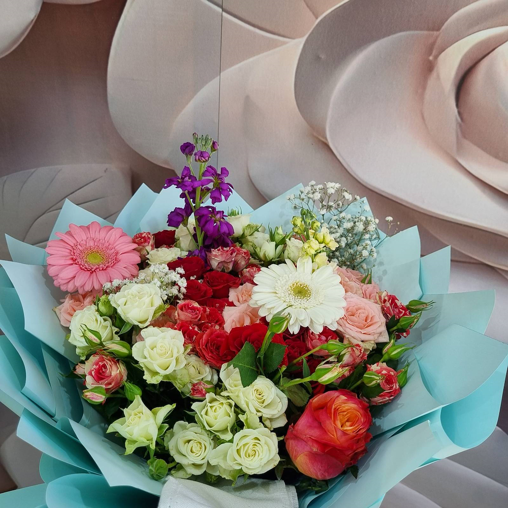 A bouquet featuring roses, baby roses, and gerberas.