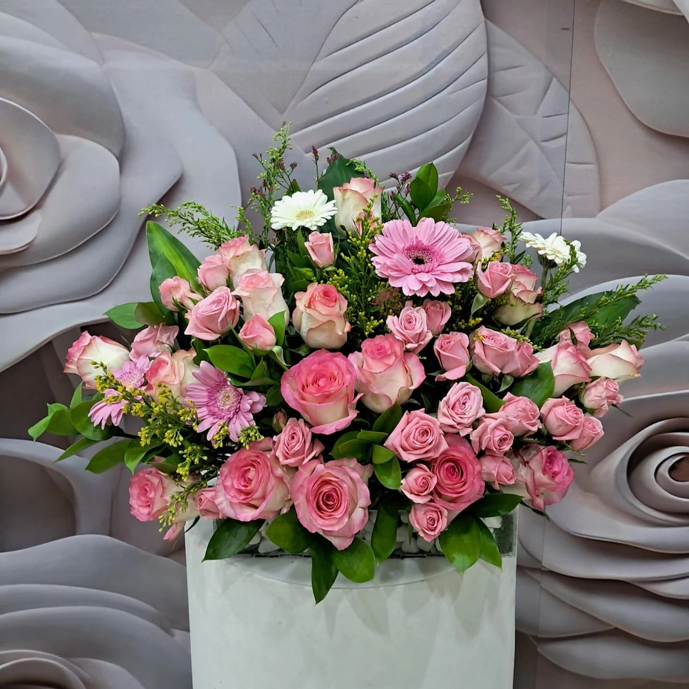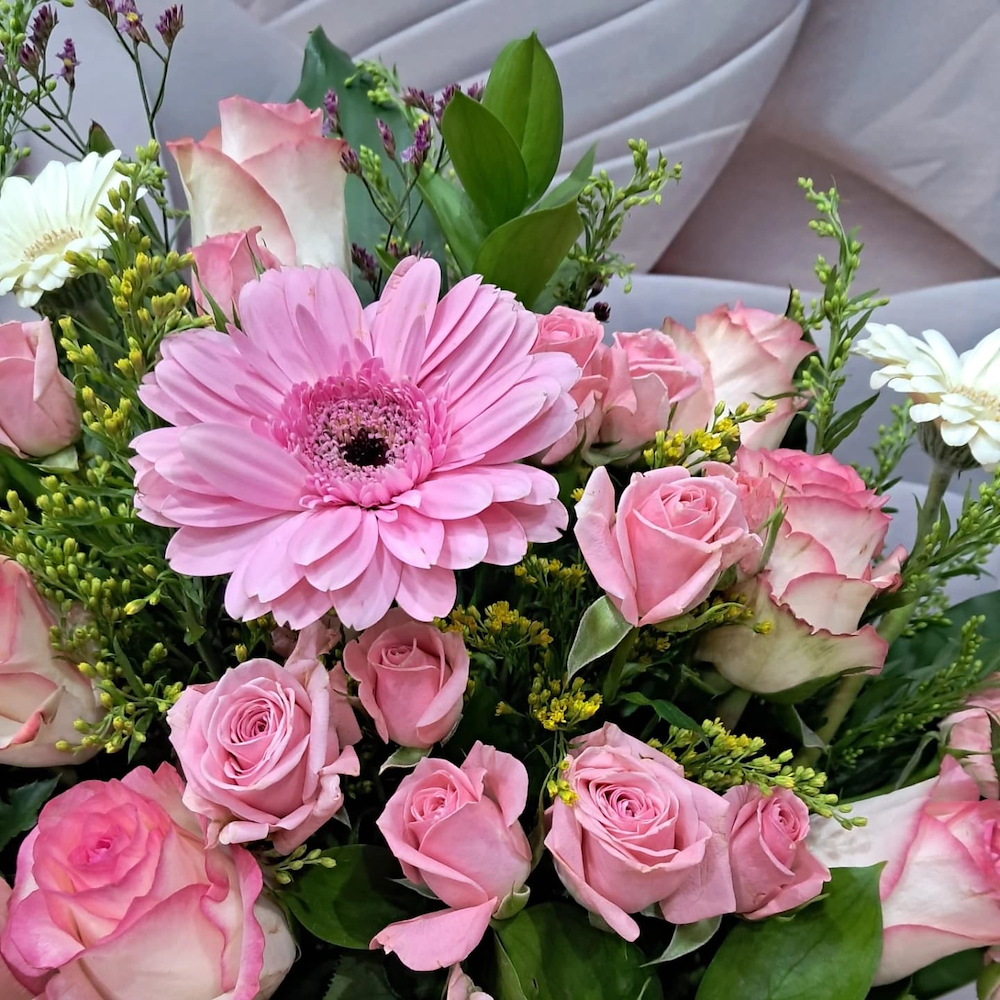 The bouquet contains roses, baby roses, and gerberas with ruscus stems.