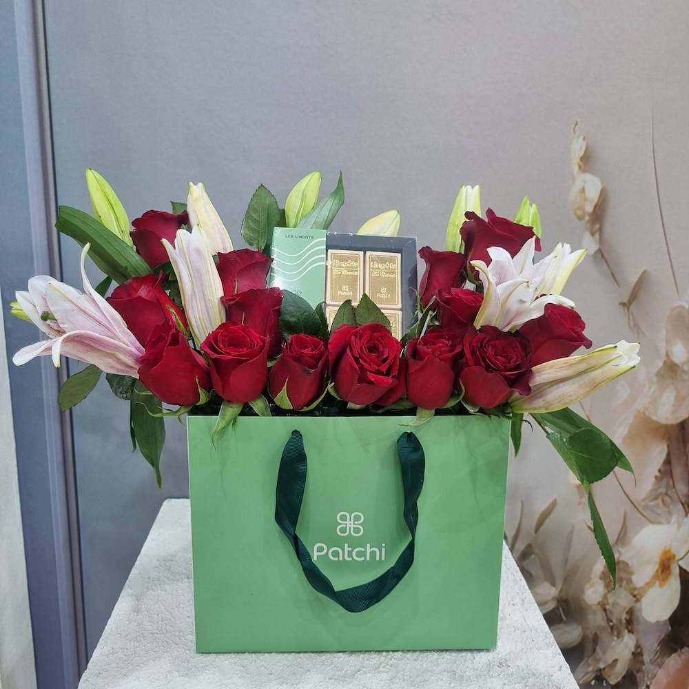 This bouquet contains red roses and pink lilies with Patchi chocolates.