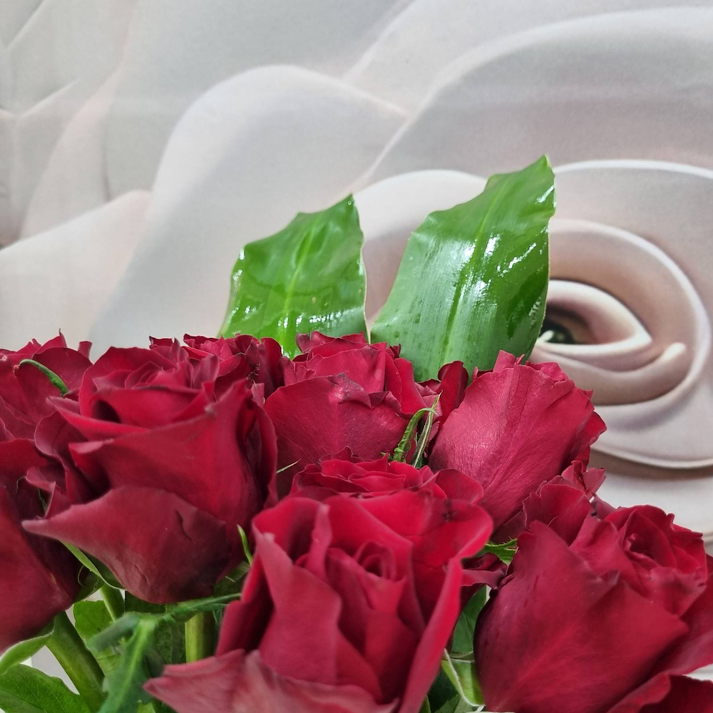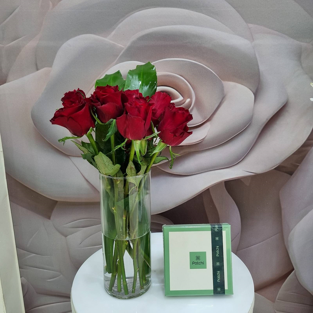 A bouquet containing red roses, arranged beautifully, and comes with Patchi chocolates.