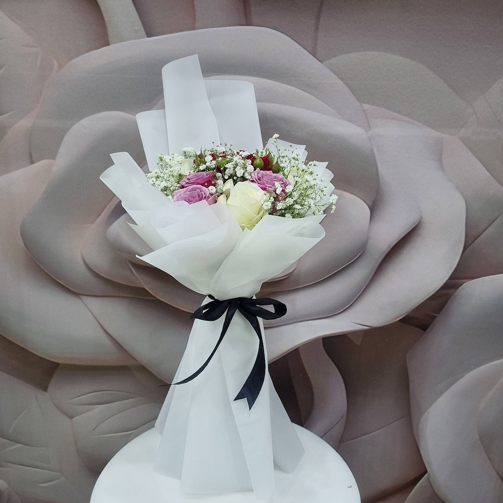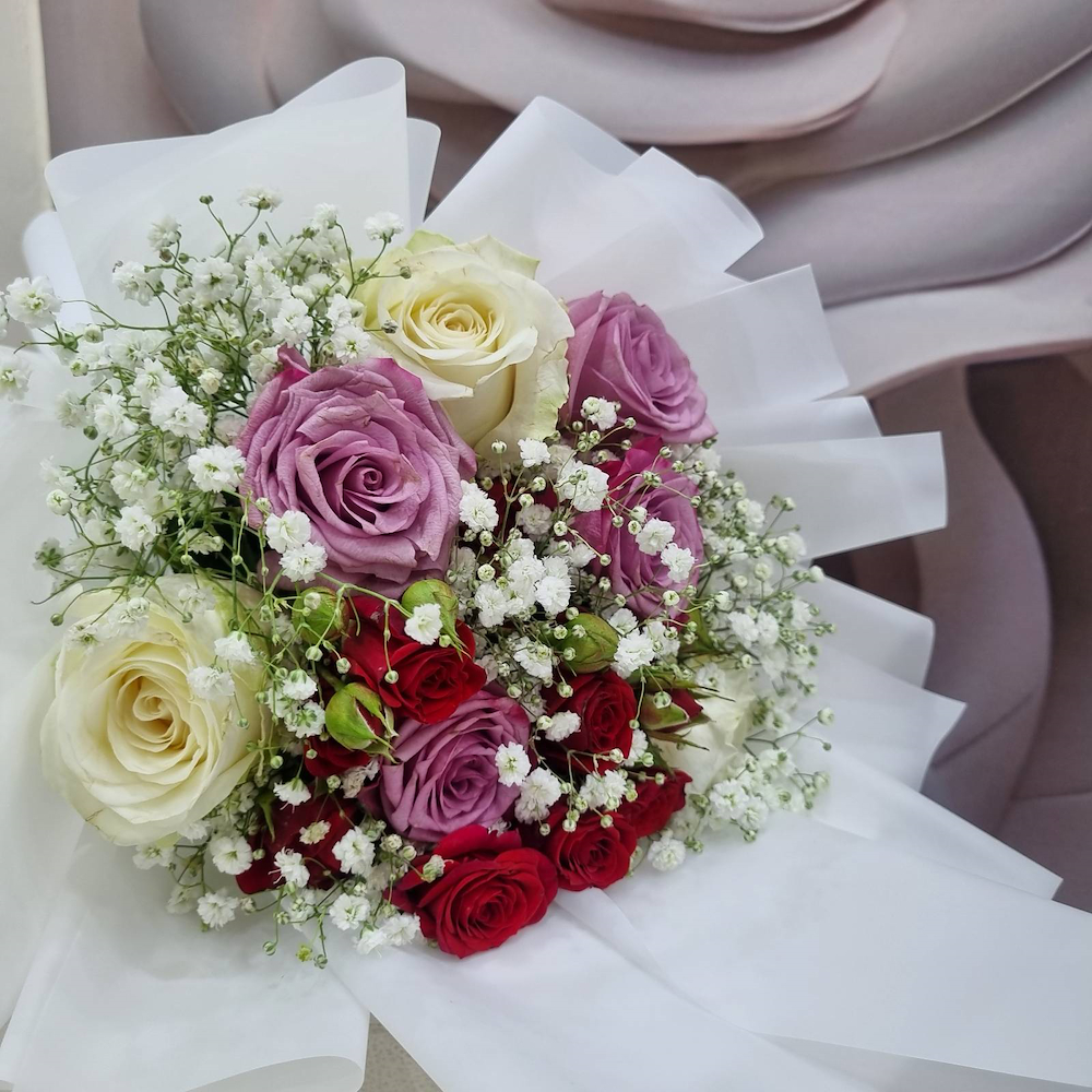 A hand bouquet containing baby roses and gypsophila, arranged beautifully.