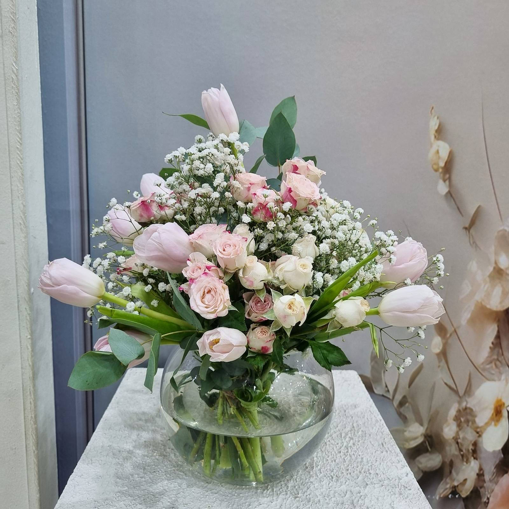 This vase contains baby roses, gypsophila, and tulips.