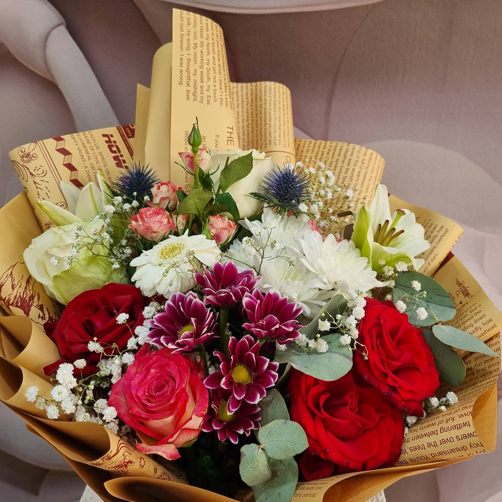 A hand bouquet containing roses, baby roses, lilies, gypsophila, and chrysanthemums, arranged beautifully.