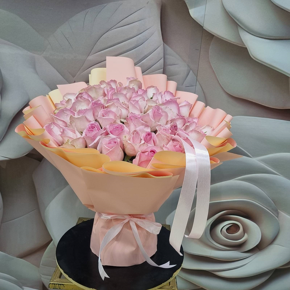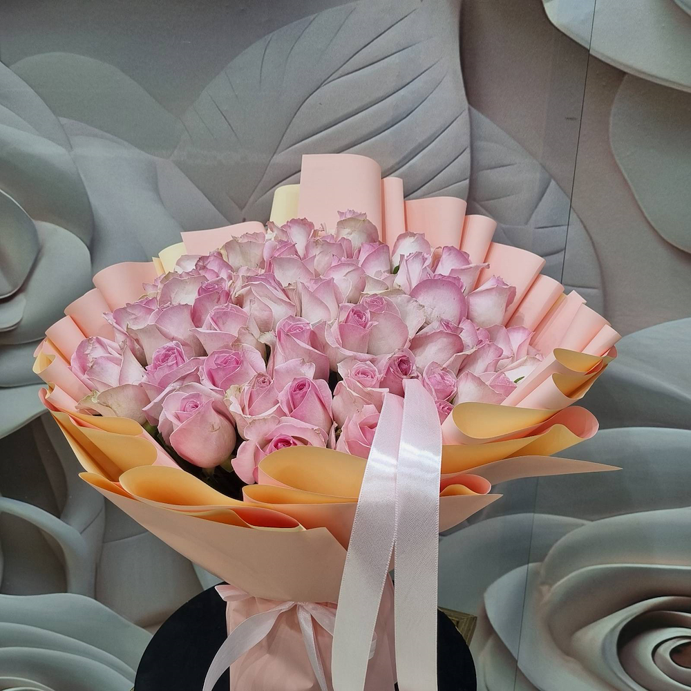 A hand bouquet containing 50 pink roses, arranged beautifully.