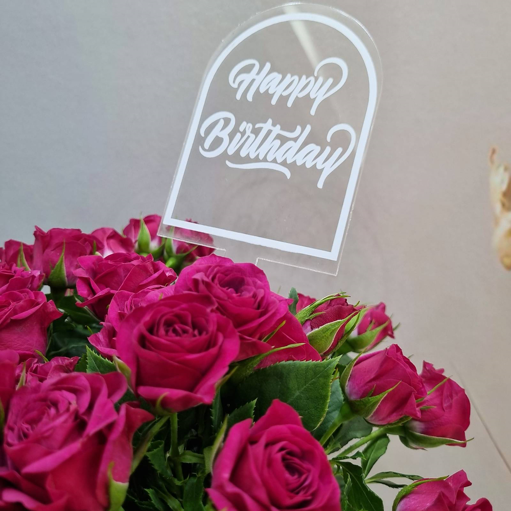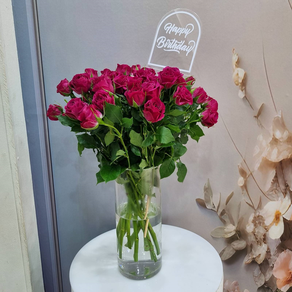 A vase filled with purple baby roses with a topper.