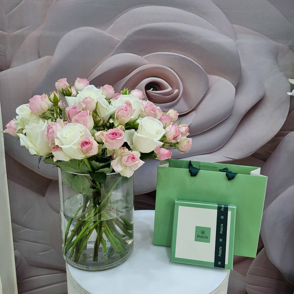 A vase filled with roses and baby roses with Patchi chocolates.