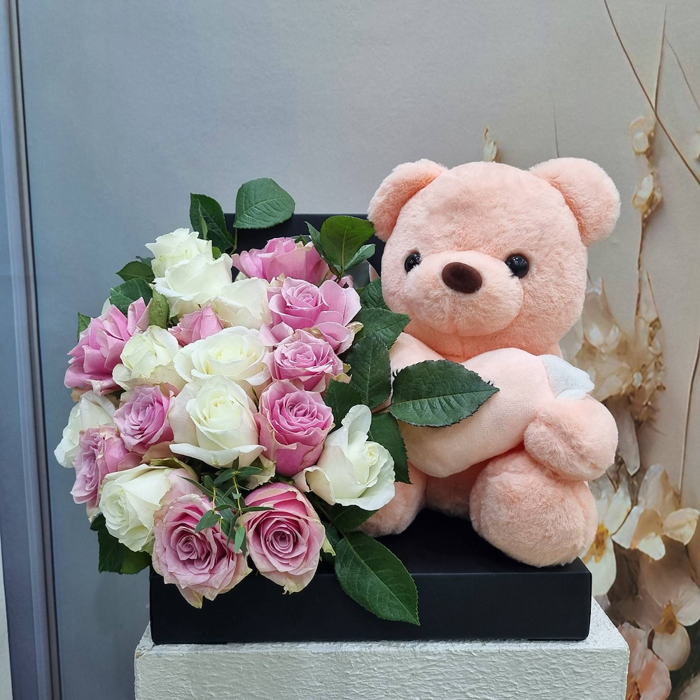 This bouquet contains white and pink roses with a teddy bear, arranged on a black stand.