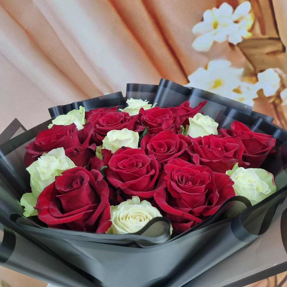 A bouquet containing red and white roses, arranged beautifully.