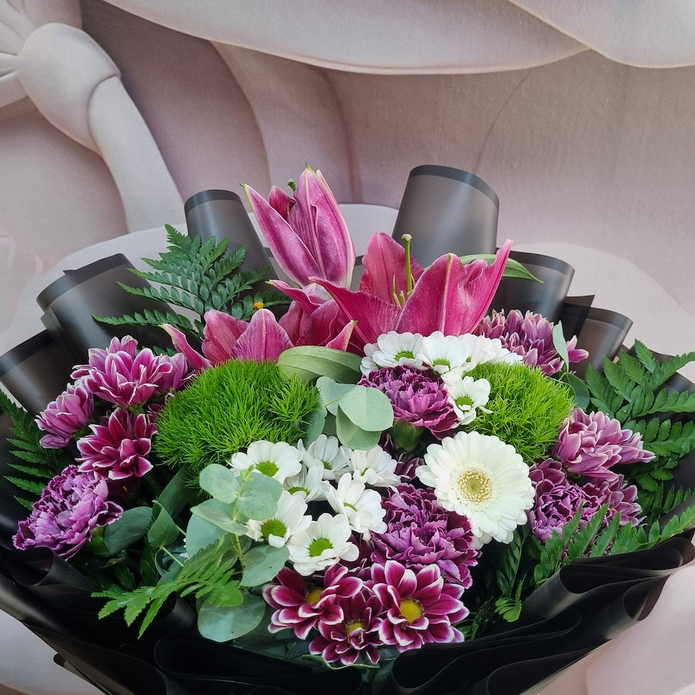 A hand bouquet containing lilies, gerberas, and chrysanthemums, arranged beautifully.