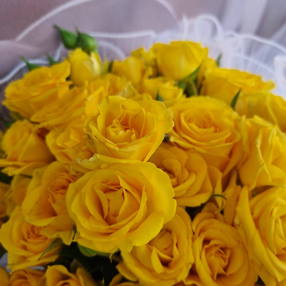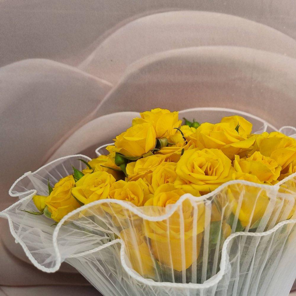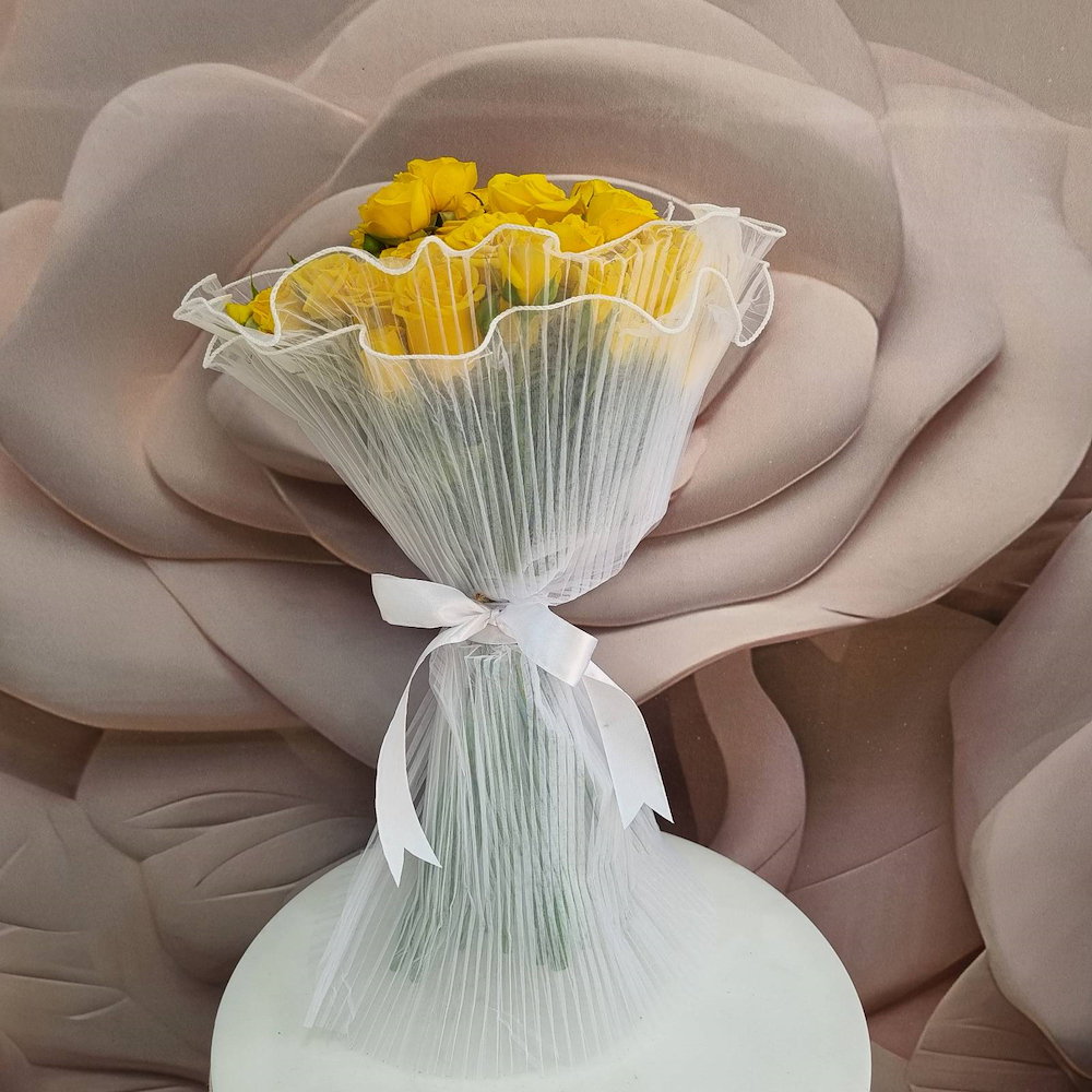 The bouquet contains baby roses in yellow, wrapped in elegant, transparent white.