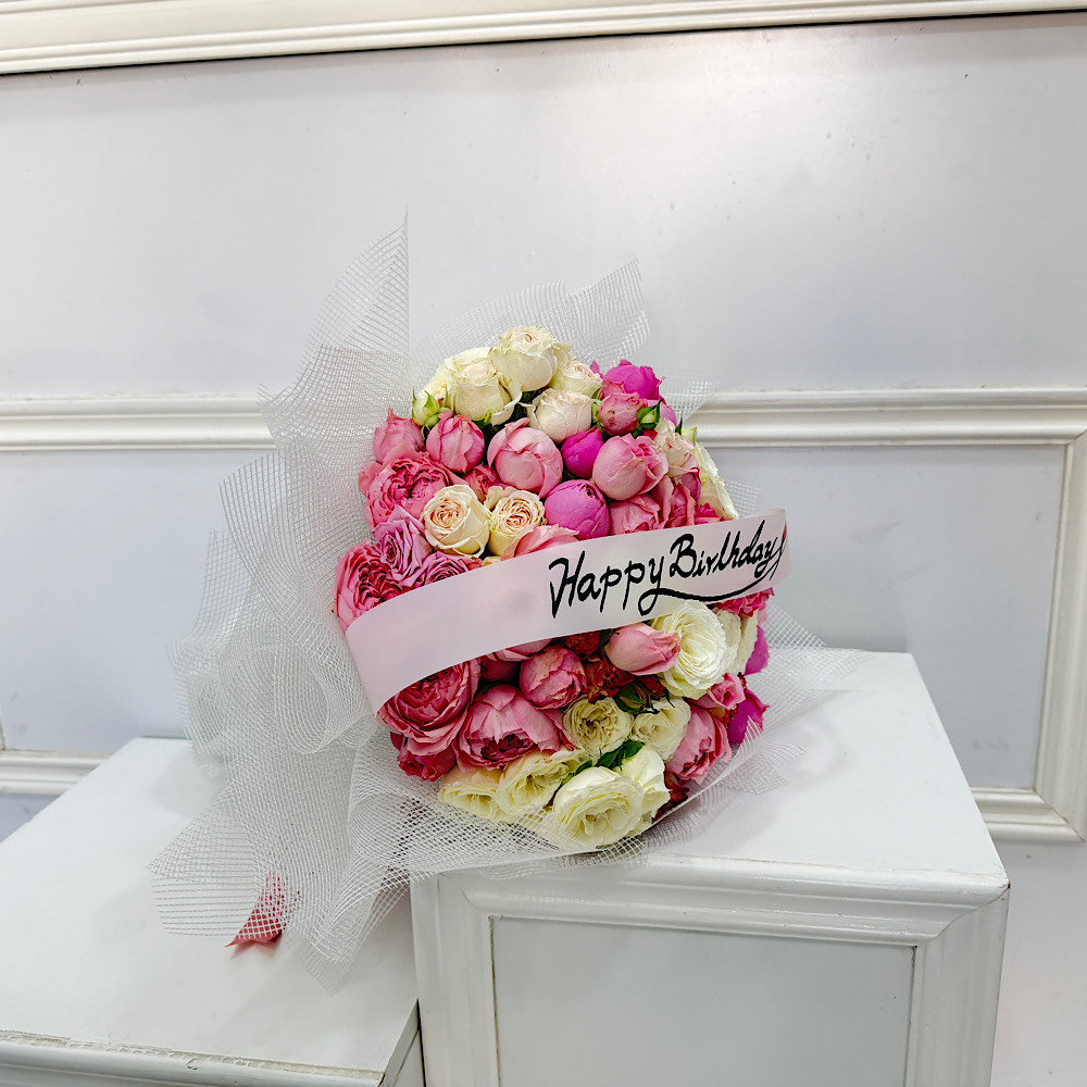 A distinctive and modern hand bouquet in the shape of a butterfly that contains rose, lily, and chrysanthemum flowers.