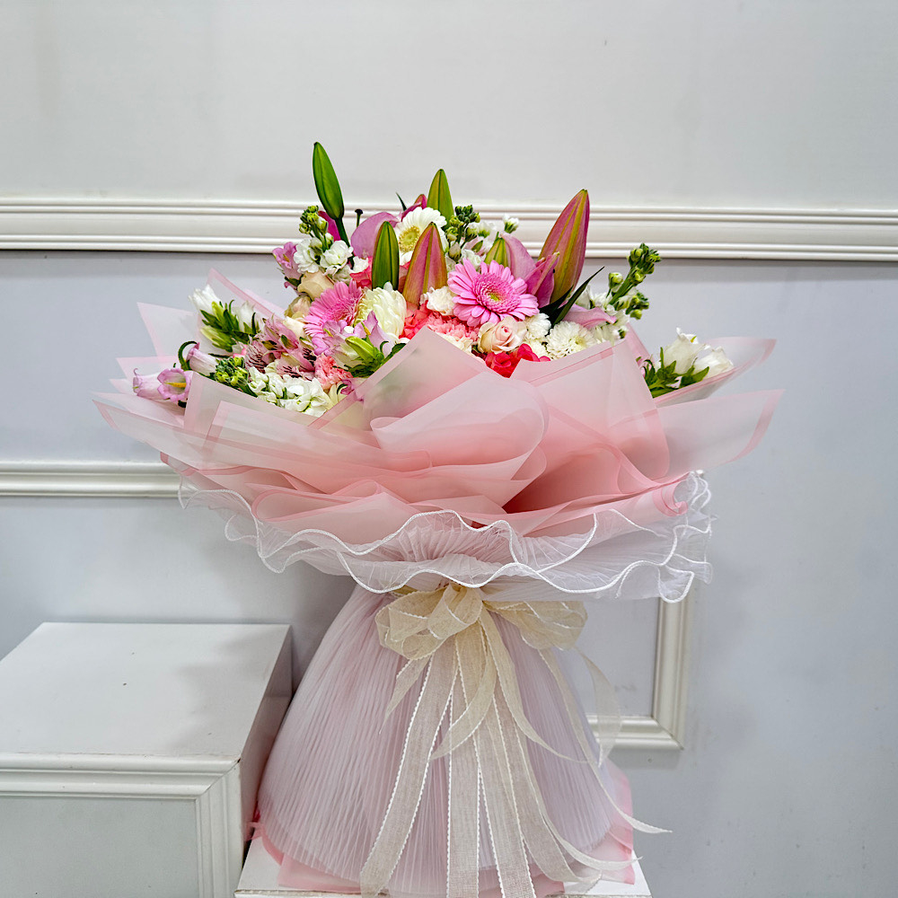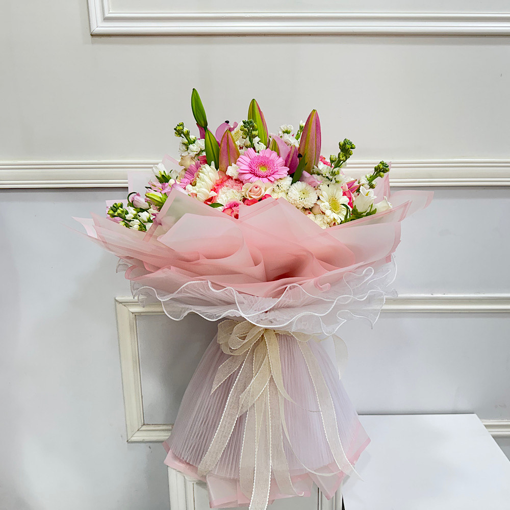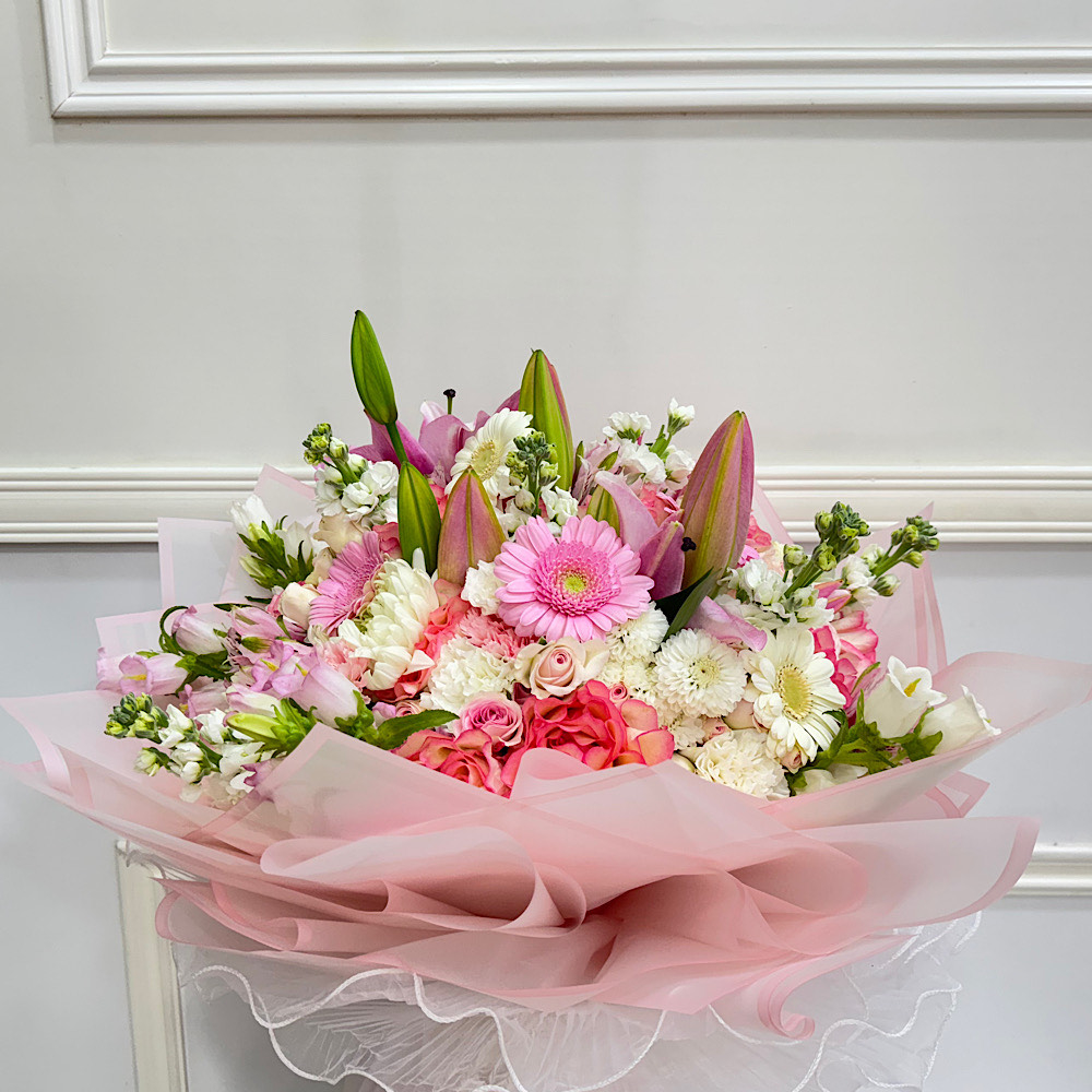 A hand bouquet that contains roses, gerberas, lilies, chrysanthemums and matthiolas.