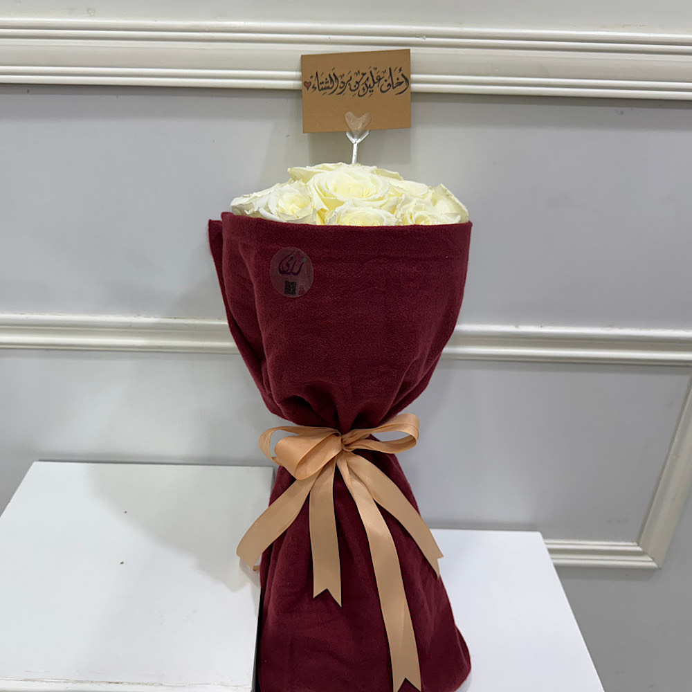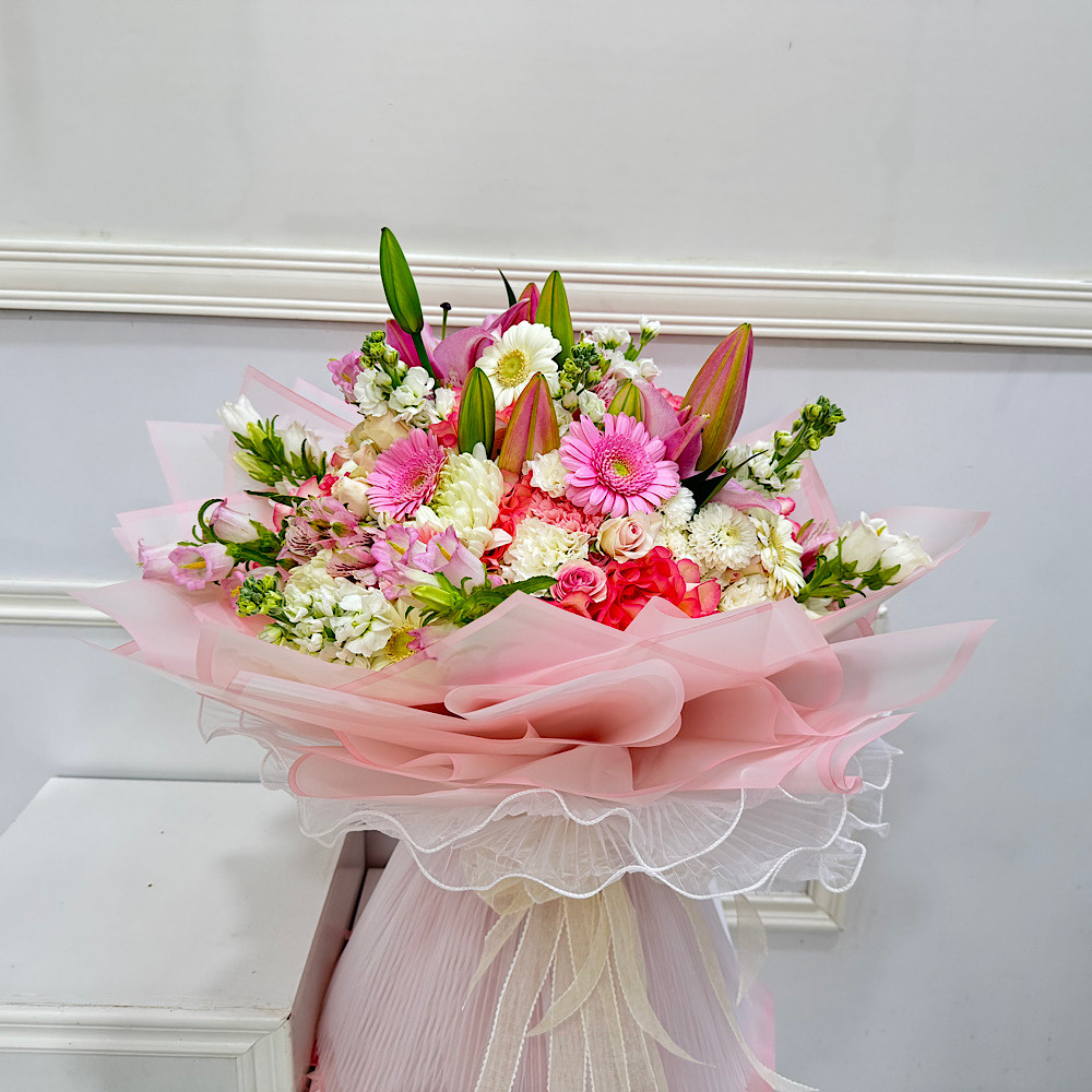 This hand bouquet contains rose and alstroemeria flowers. The writing on the ribbon can be customized.