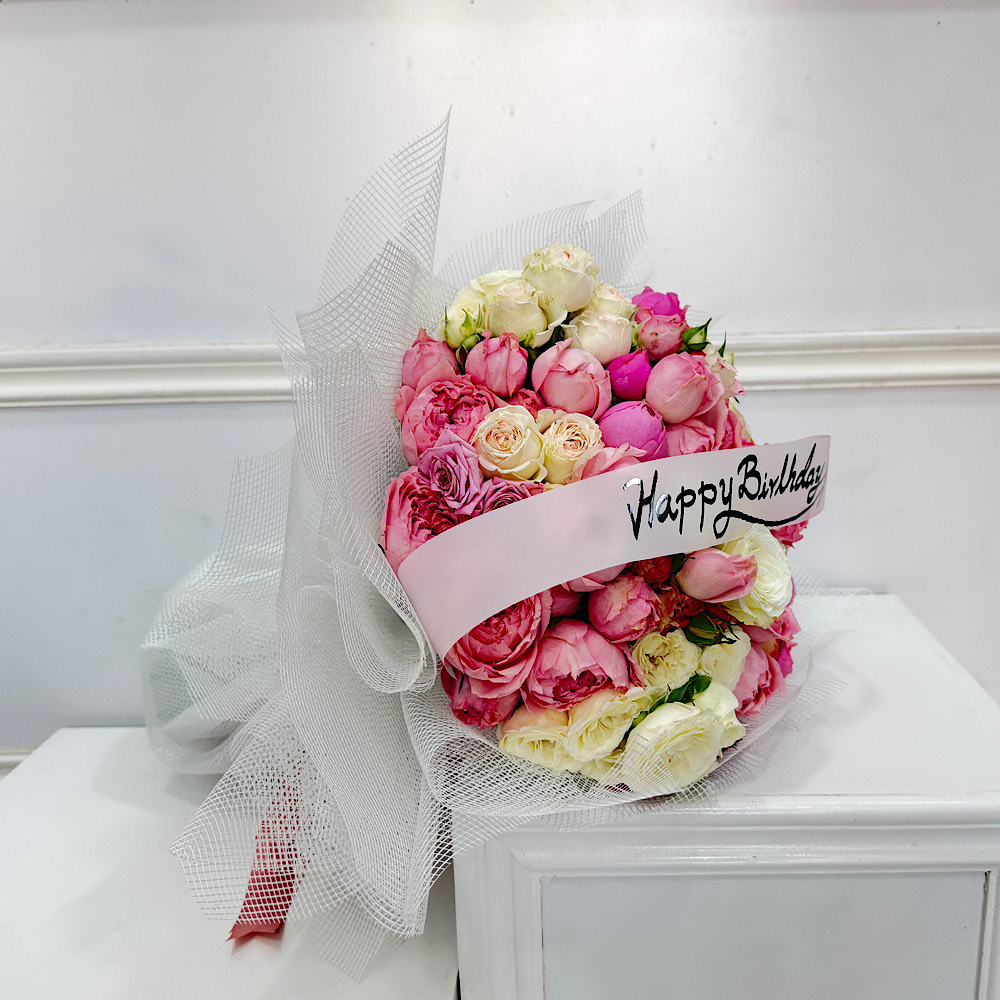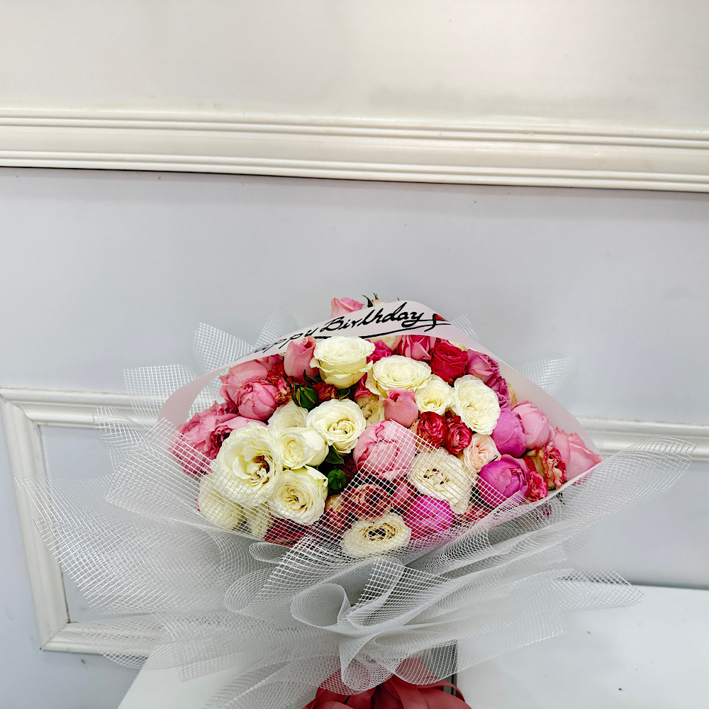 An elegant bouquet of colorful baby roses, wrapped in a modern and unique packaging, finished with a Happy Birthday ribbon. A perfect choice for a joyful and delicate birthday gift.