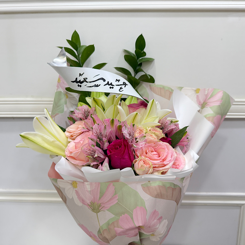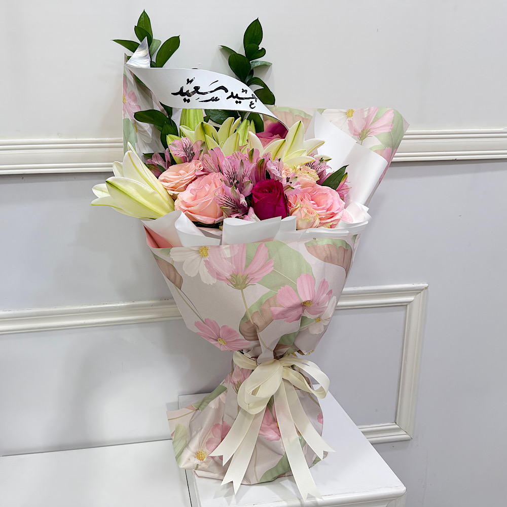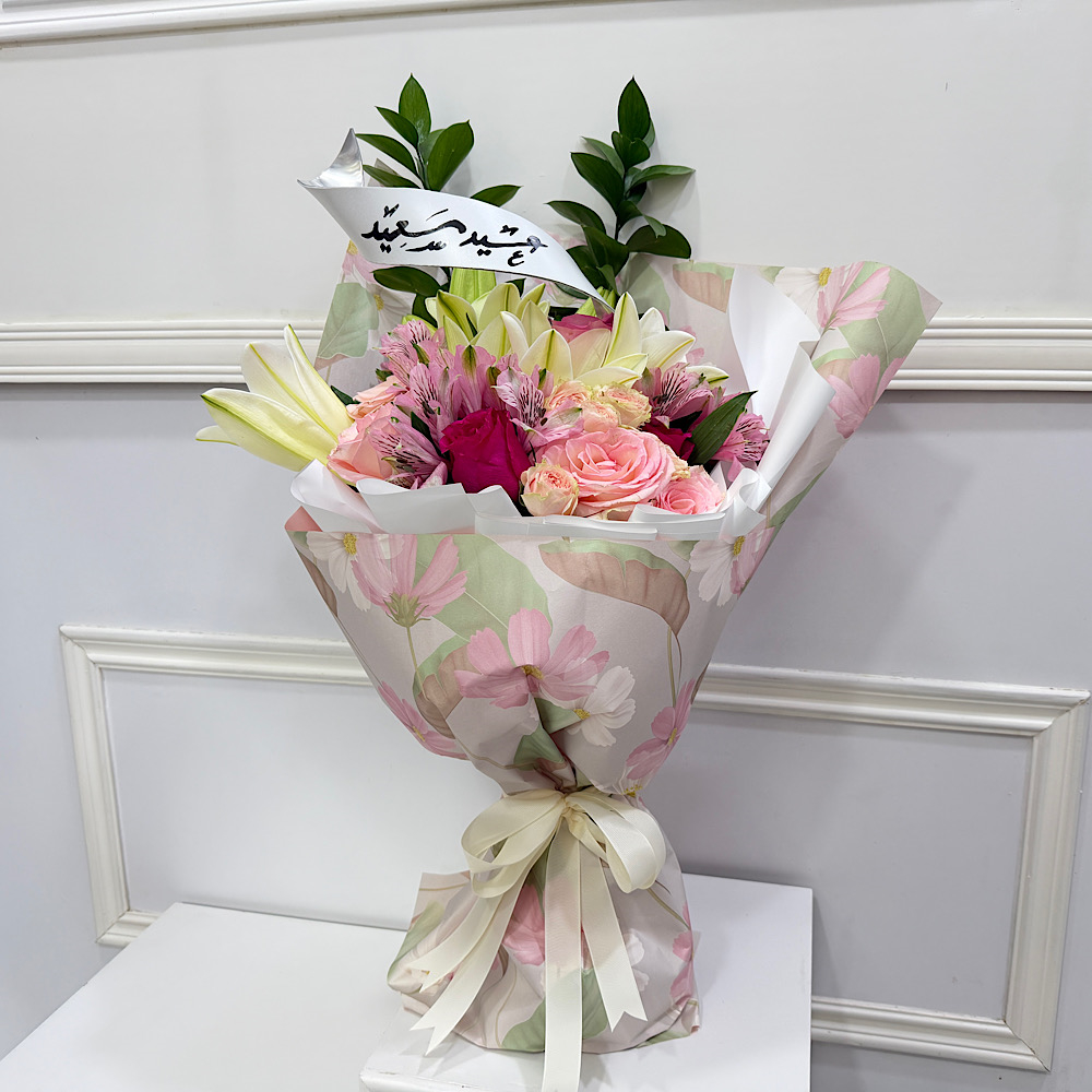 A hand bouquet that contains roses, alstroemerias and lilies.