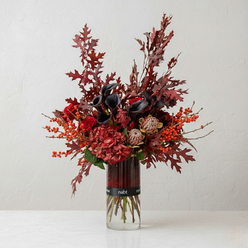 An elegant bouquet featuring velvety calla lily, hydrangea, and amaranthus flowers with dark red autumn oak leaves and glossy red berries for a rich, warm look.