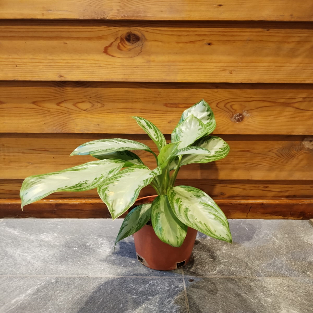 A stunning foliage plant with broad leaves showcasing shimmering silver centers framed by deep green edges, bringing a sense of calm and openness to any space. Ideal as an office companion, it thrives in low to medium light, tolerates occasional neglect, and helps refresh the air while maintaining its lush appearance. Care guide: Prefers medium to low indirect light, water when the top 2–3 cm of soil is dry, adapts well to normal humidity, grows best in temperatures between 18–27°C, and benefits from monthly feeding during spring and summer.