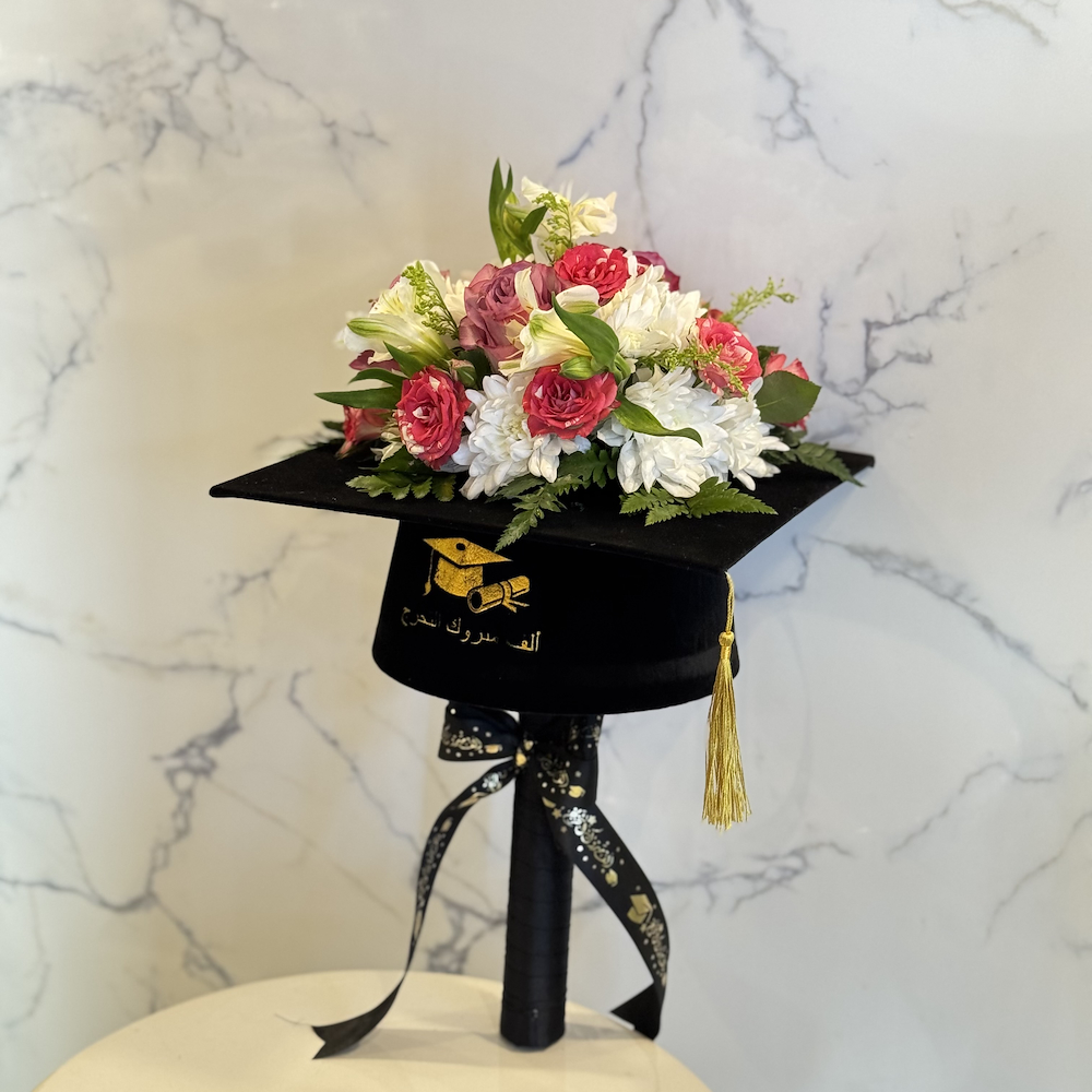 A luxurious graduation flower bouquet that contains alstroemerias, chrysanthemums and roses designed in the shape of a graduation cap.