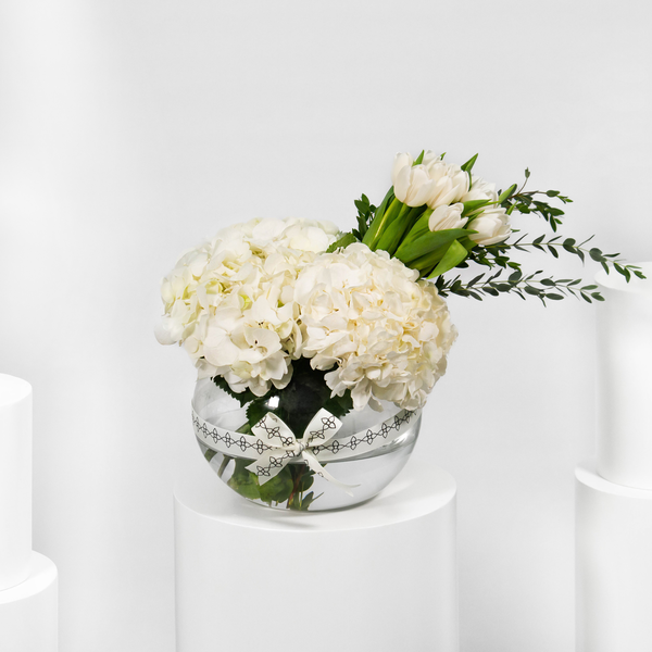 This bouquet contains roses and hydrangea.