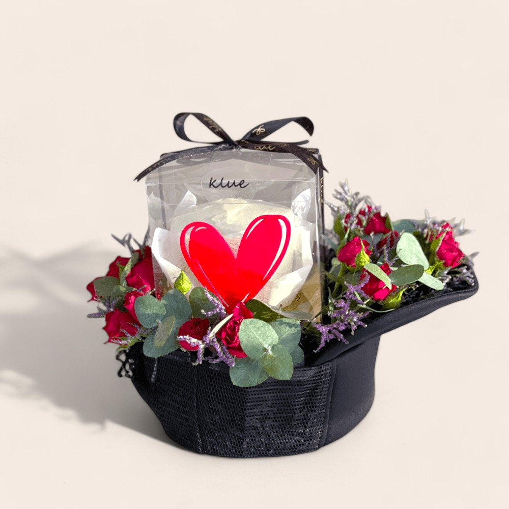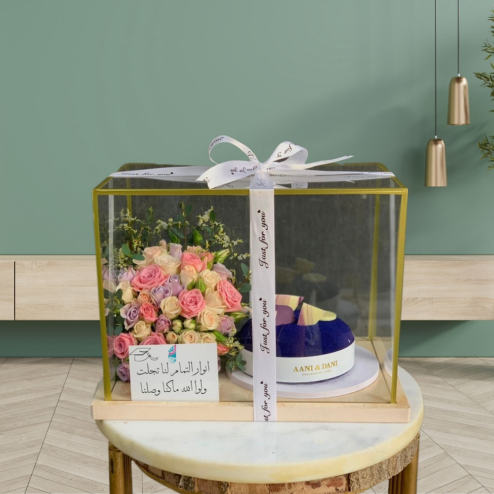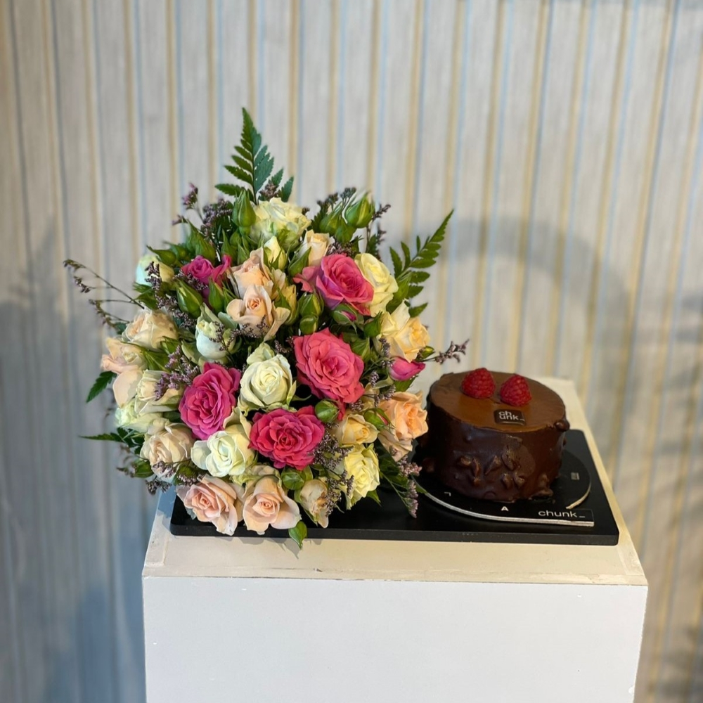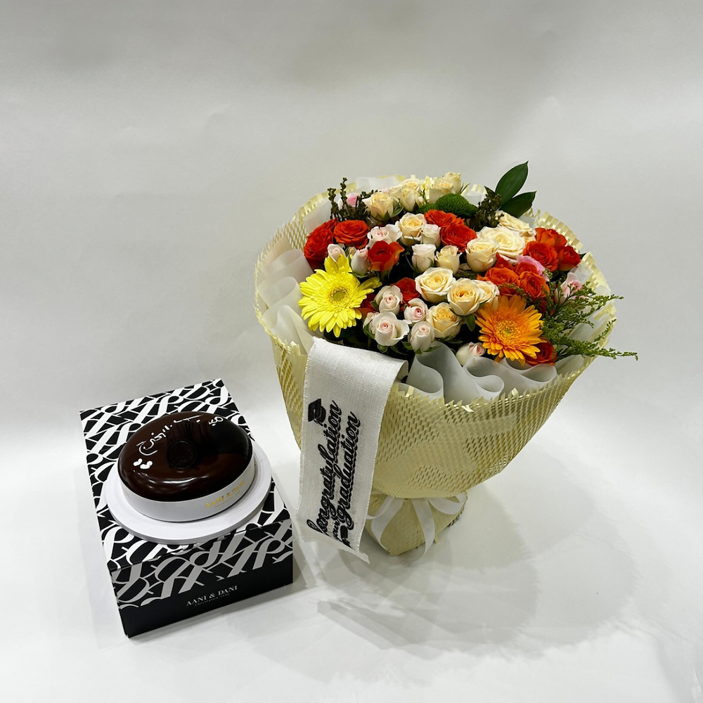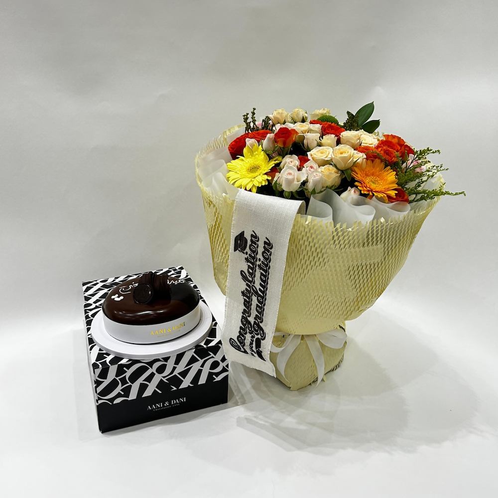 A hand bouquet that contains rose and gerbera flowers with a cake from Aani & Dani.