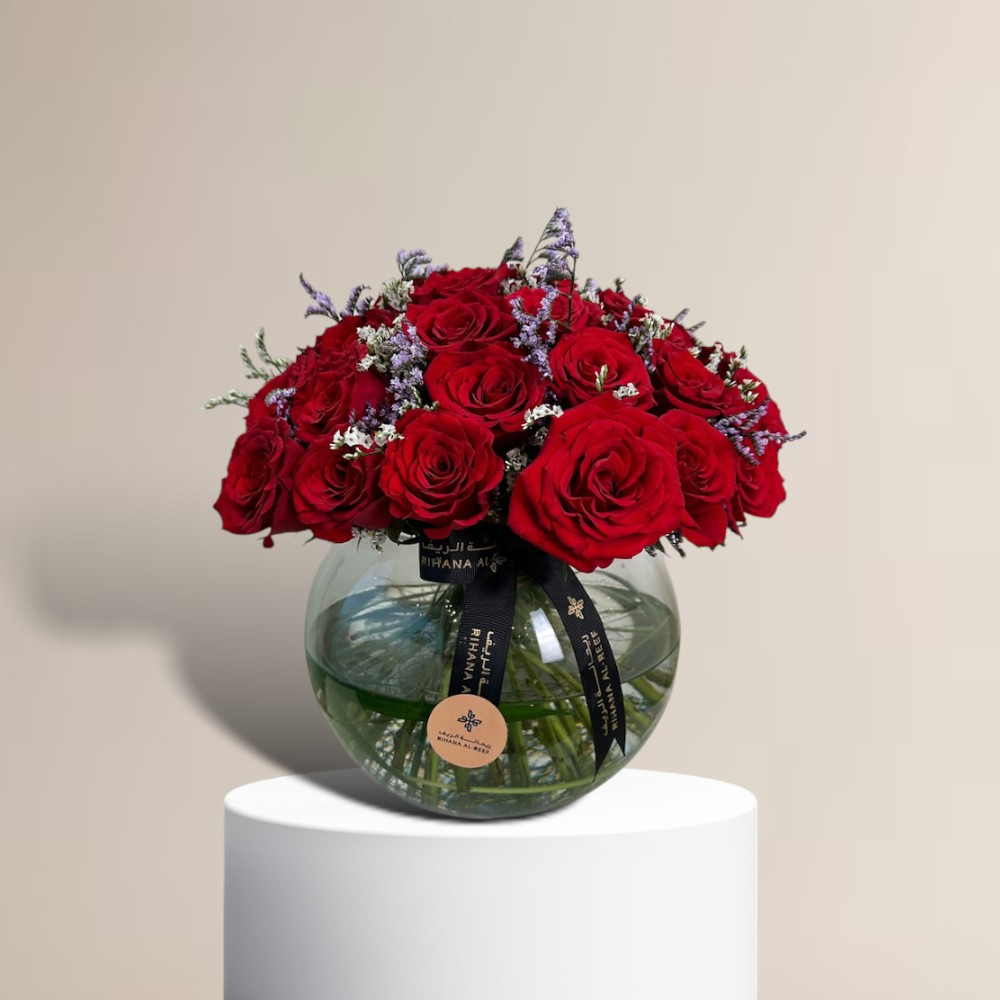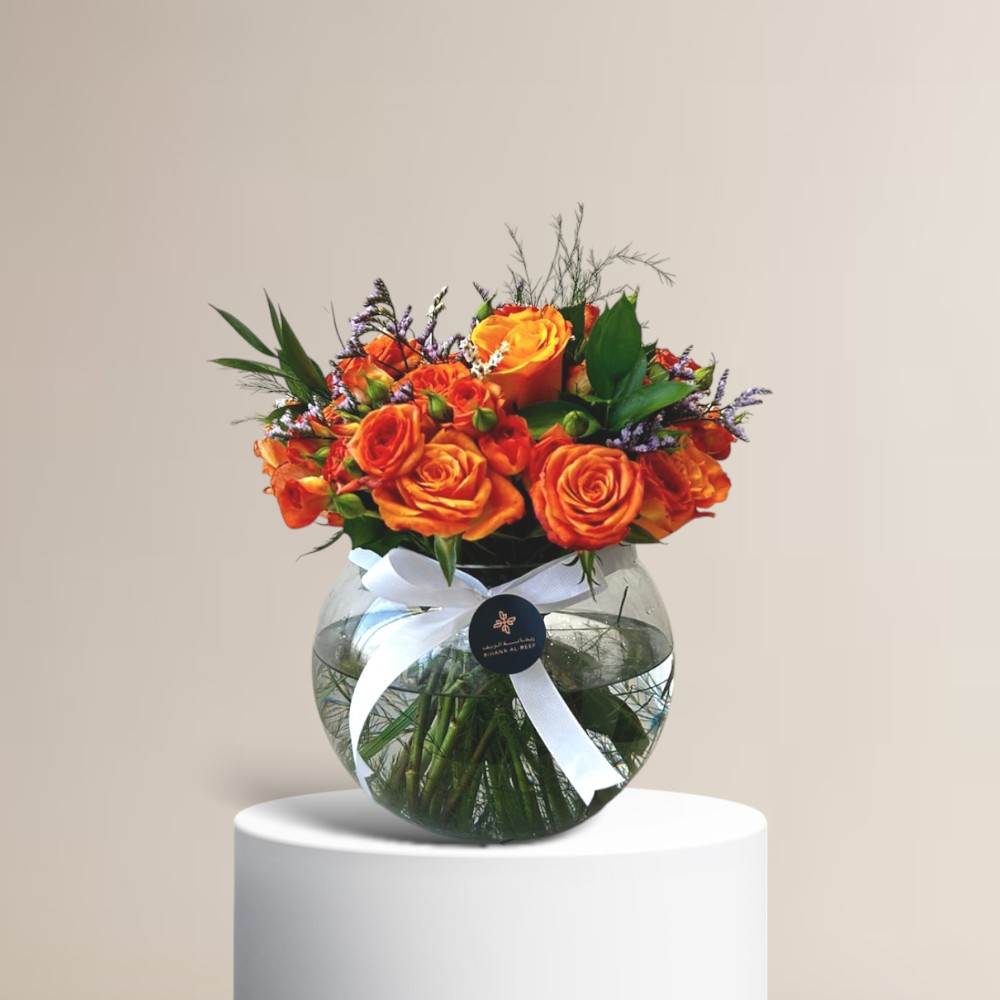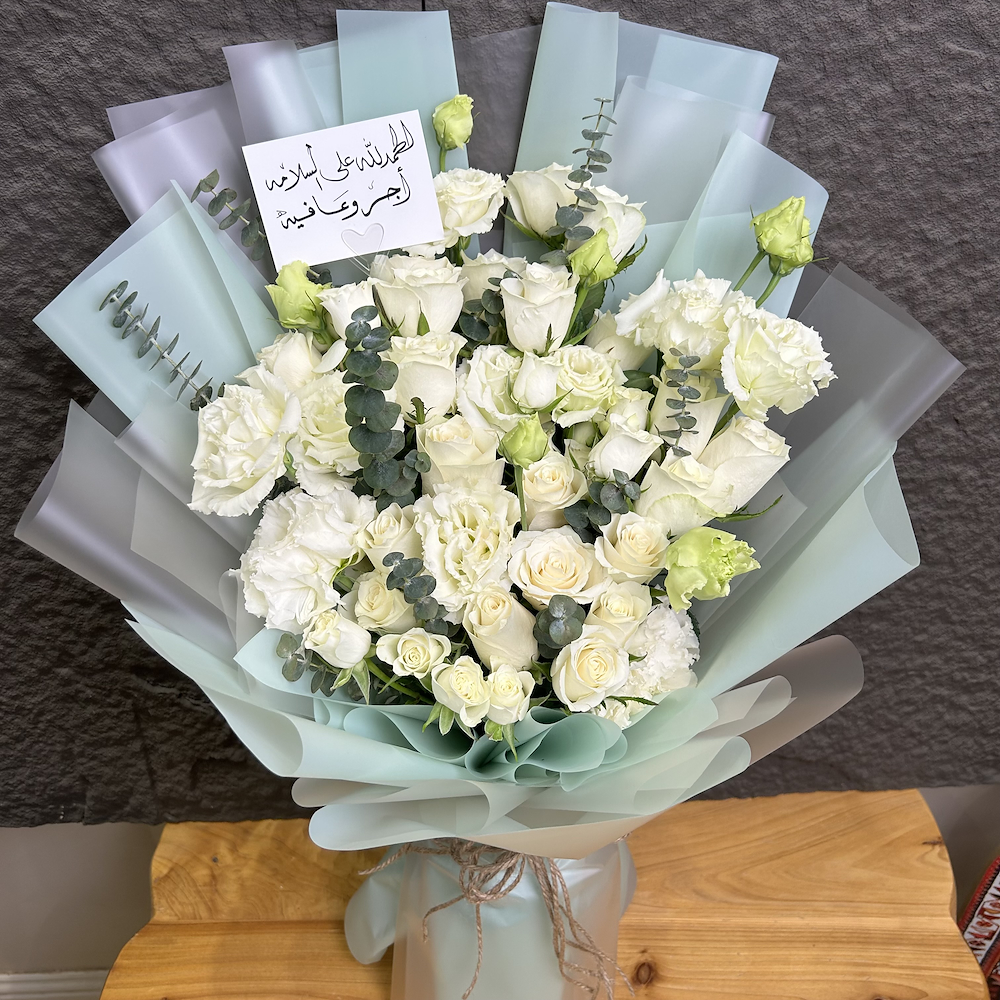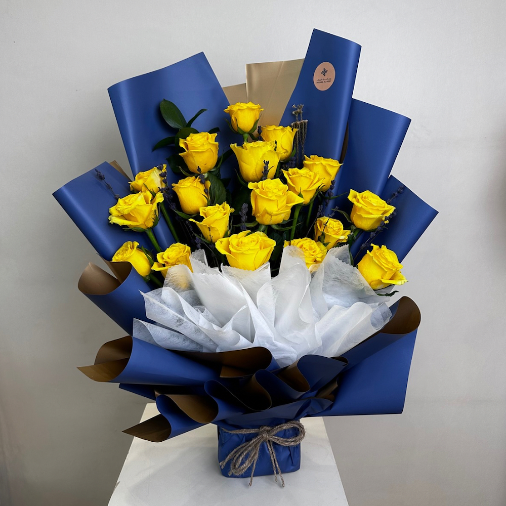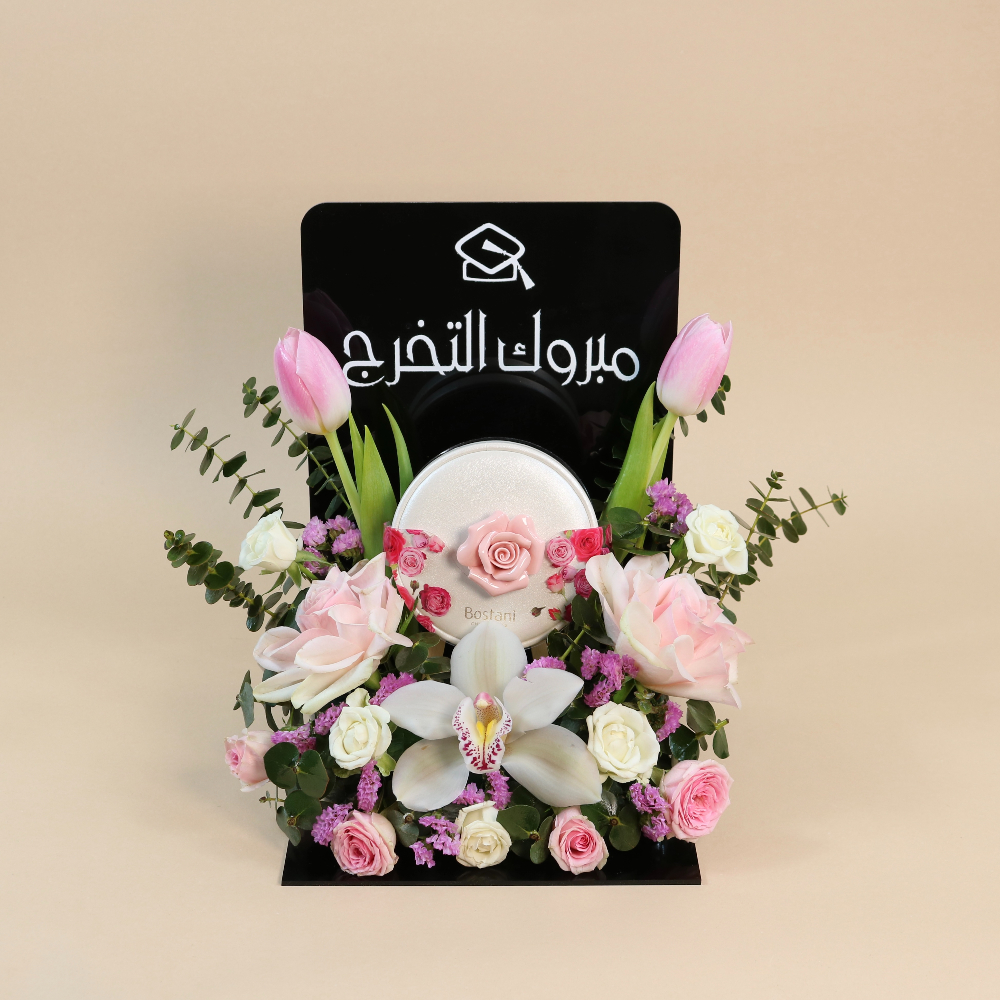 A hand bouquet that contains rose and gerbera flowers with a cake from Aani & Dani.
