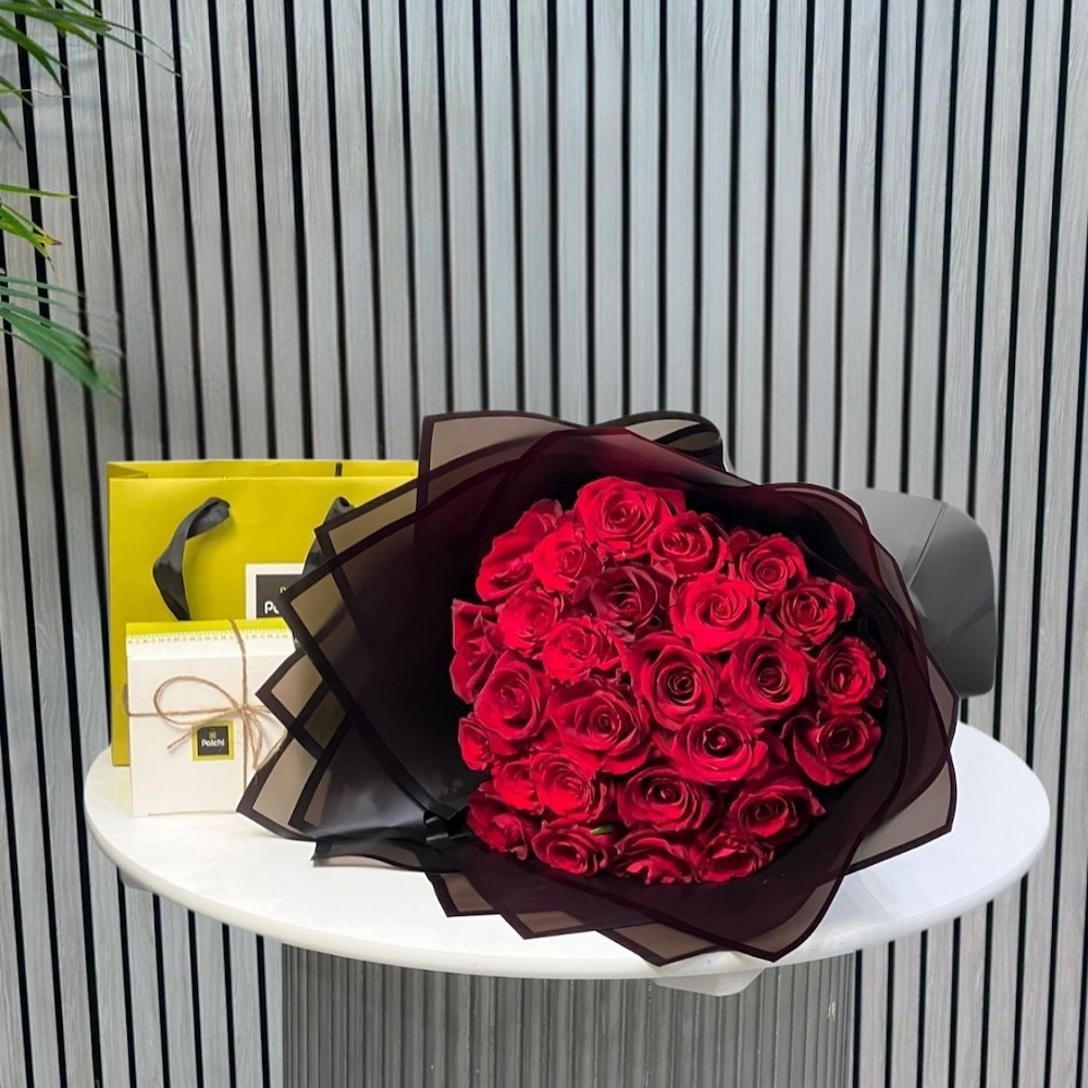 A vase that contains rose, baby rose, chrysanthemum, lily, and alstroemeria flowers with chocolates from Patchi.