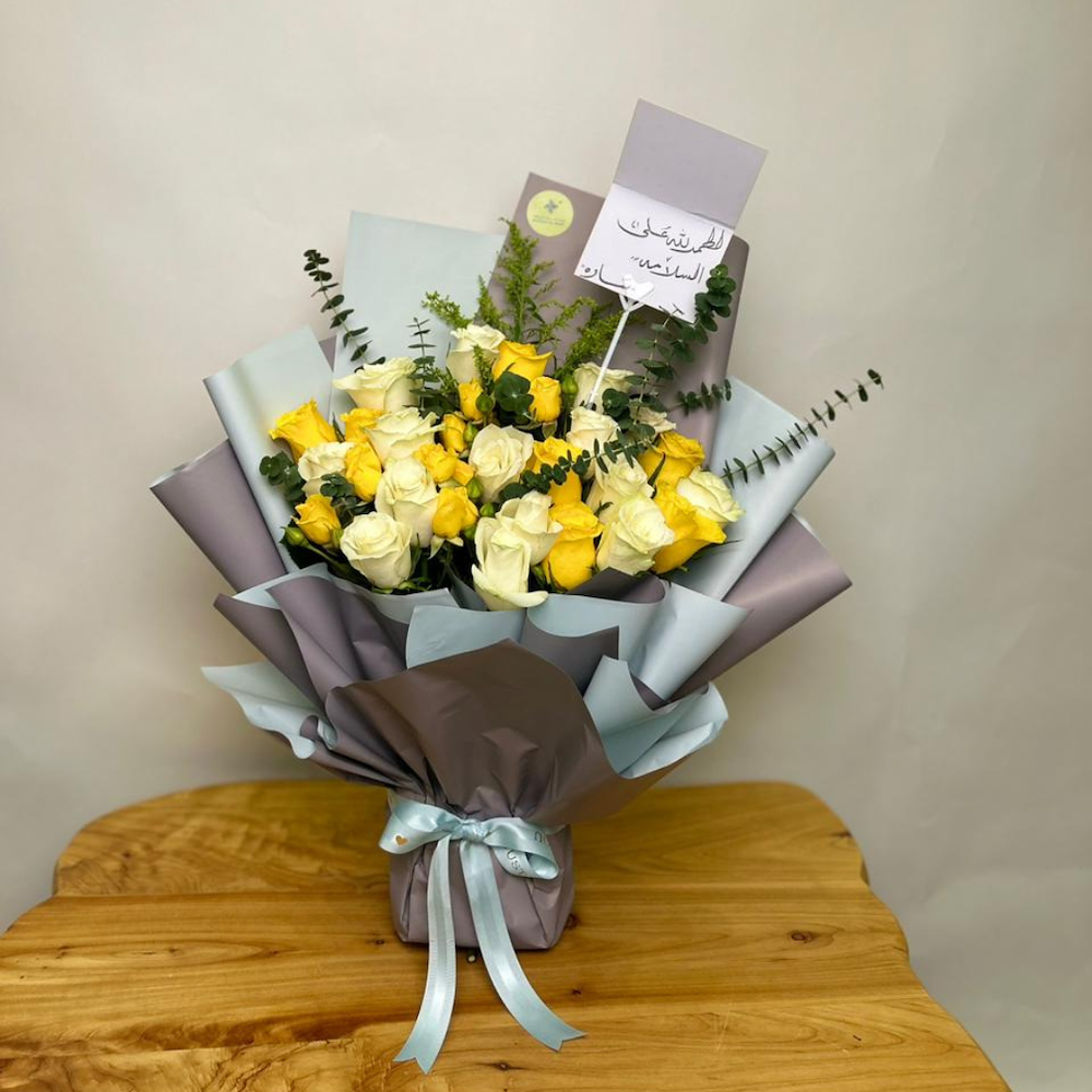 A bouquet filled with roses, baby roses, carnations and eucalyptus.