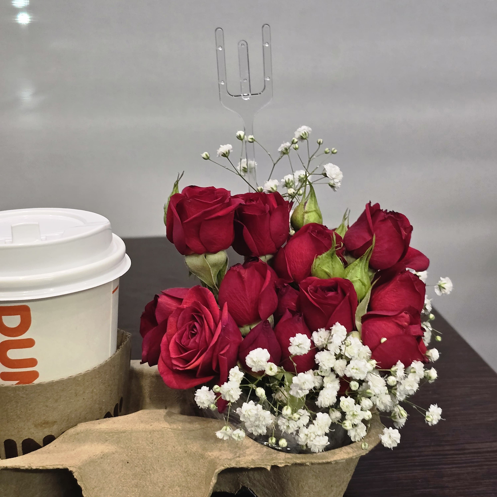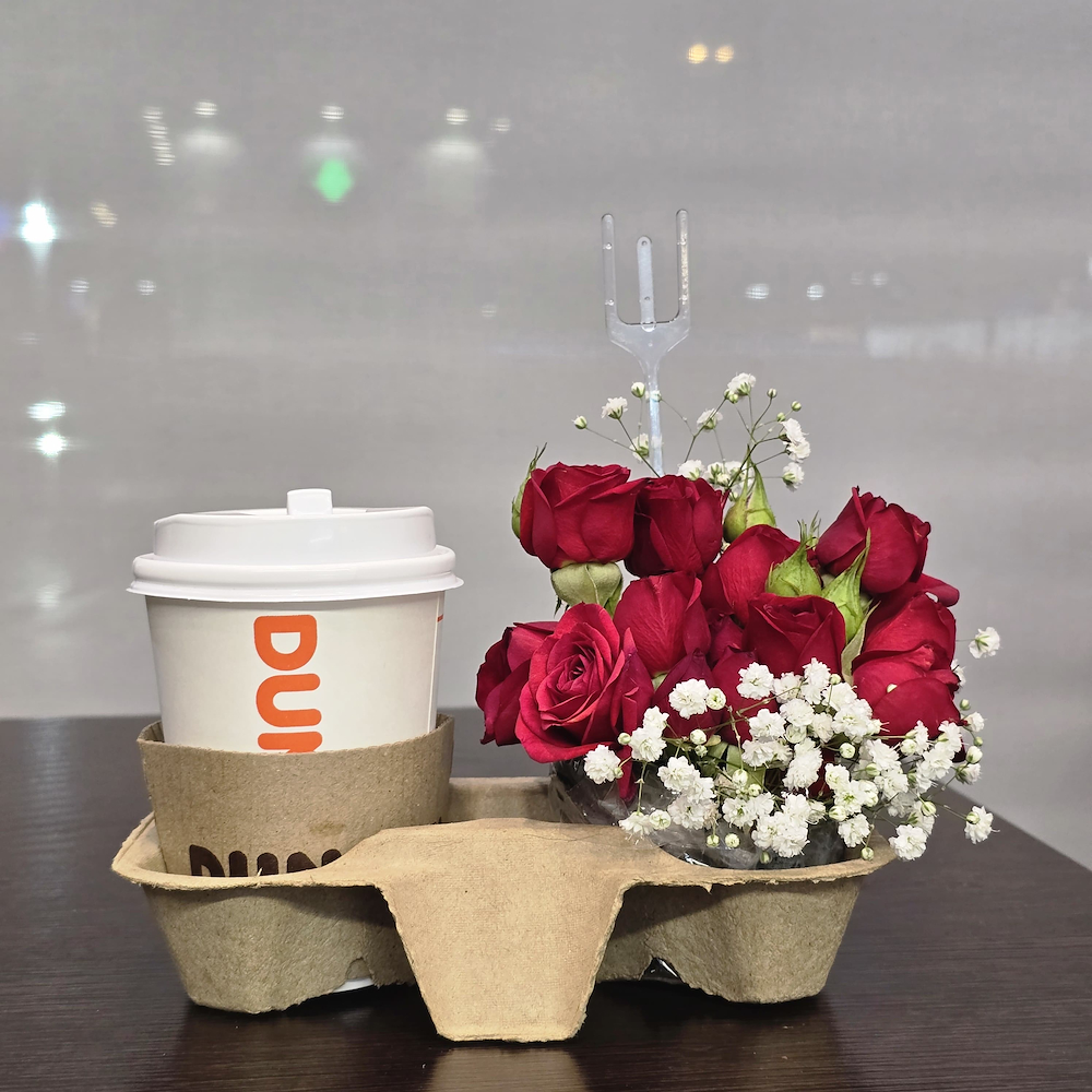 A bouquet arranged with roses and gypsophila flowers with a coffee from Dunkin.