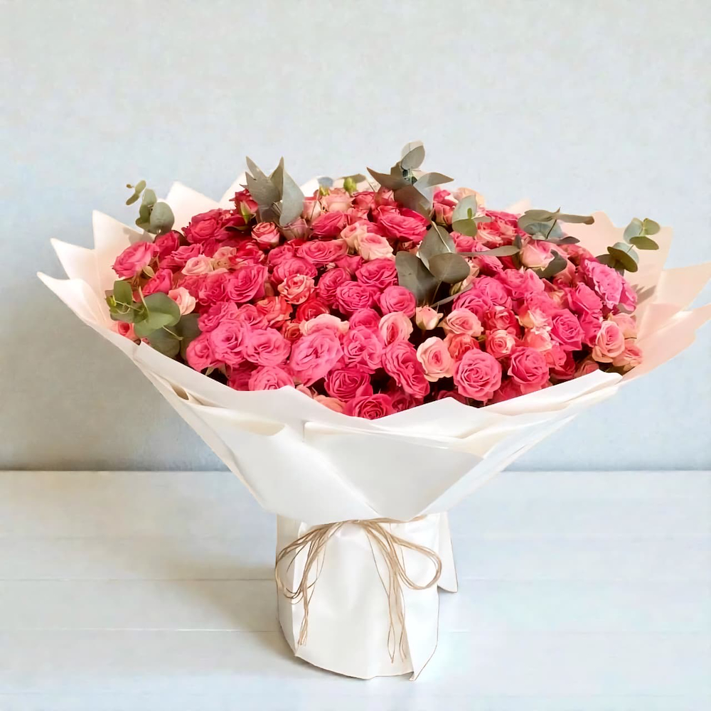 A hand bouquet containing pink roses and green leaves, arranged beautifully.