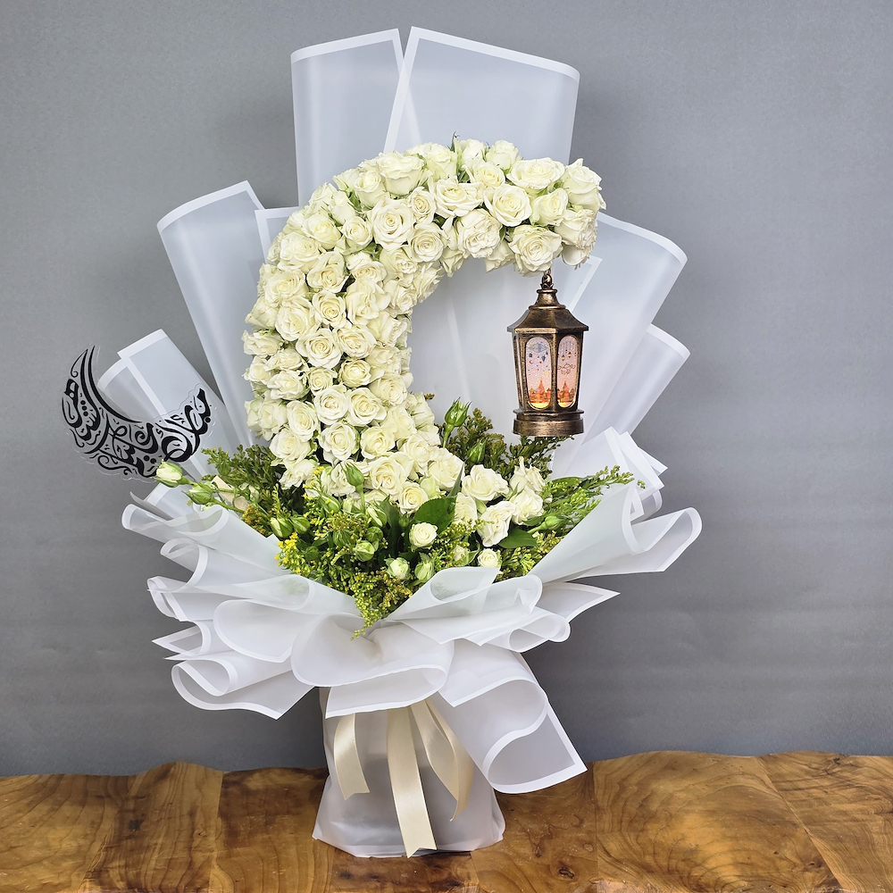 A bouquet of small white roses carefully arranged in the shape of a Ramadan crescent.