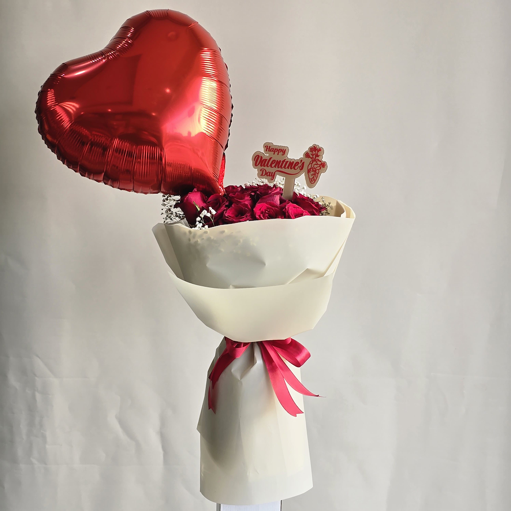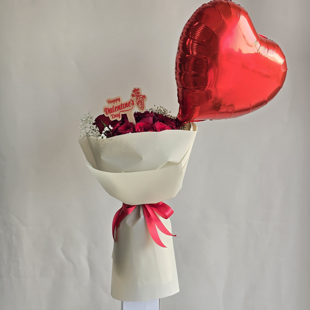 A bouquet filled with red roses with a heart-shaped balloon.