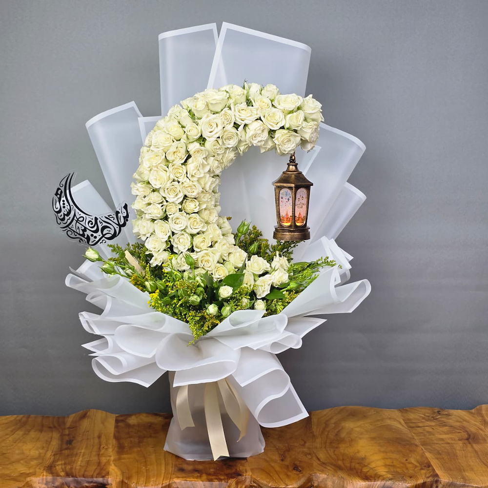A bouquet of small white roses carefully arranged in the shape of a Ramadan crescent.