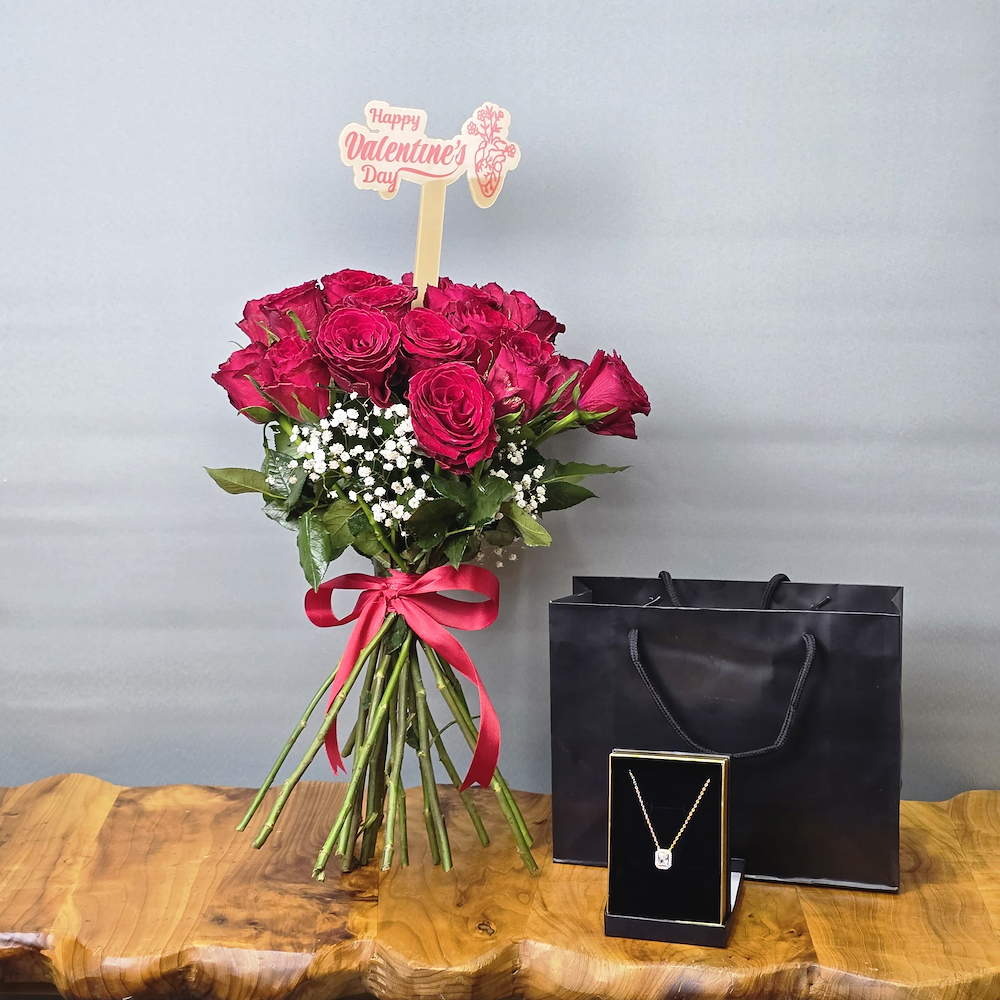 An elegant bouquet featuring red roses tied with a red ribbon with a French zircon necklace.