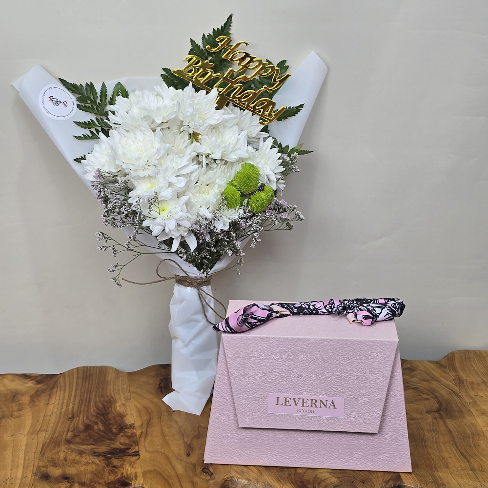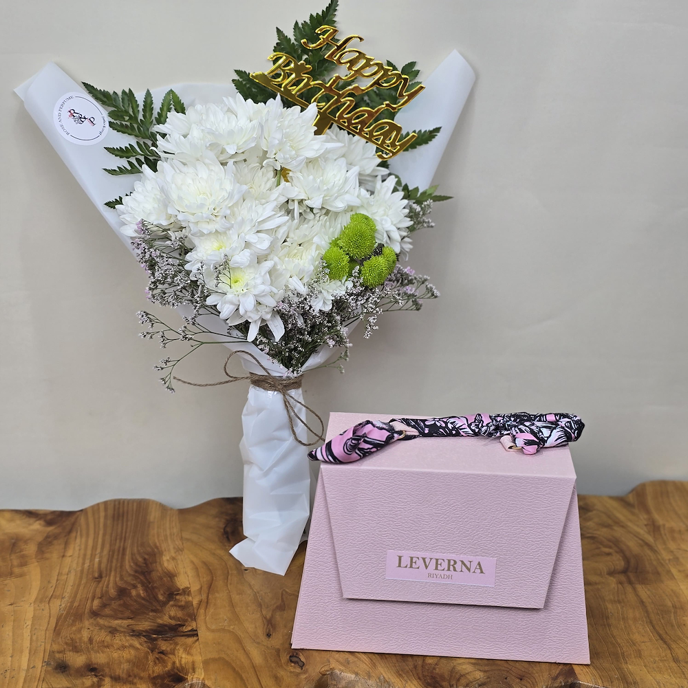 A bouquet featuring chrysanthemum flowers with a set of two Laverena perfumes.