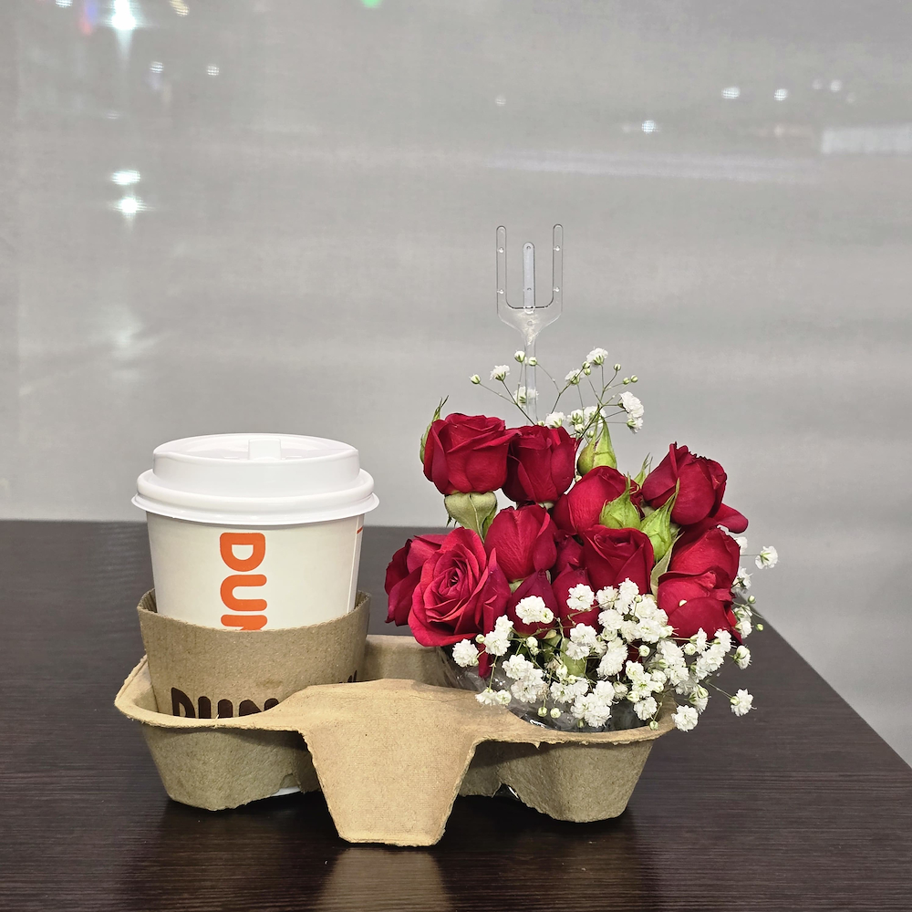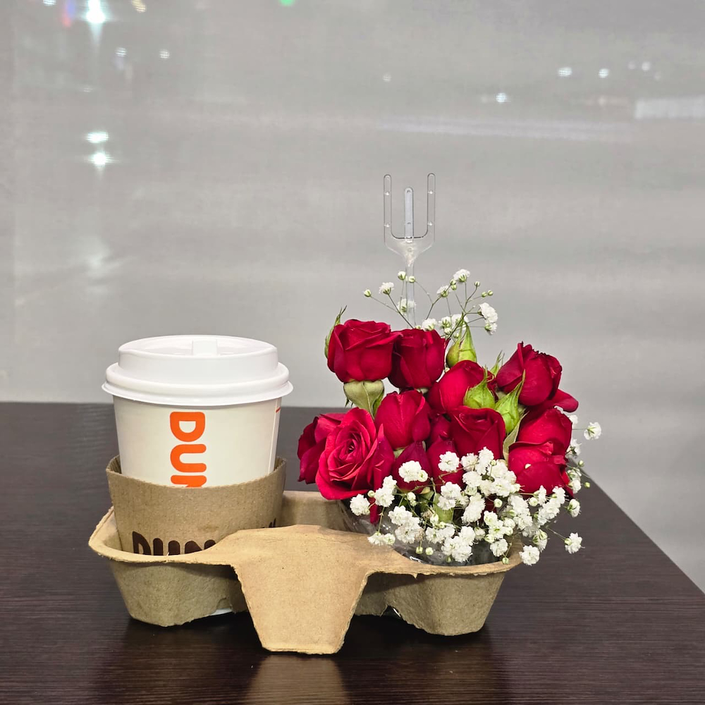 A bouquet arranged with roses and gypsophila flowers with a coffee from Dunkin.