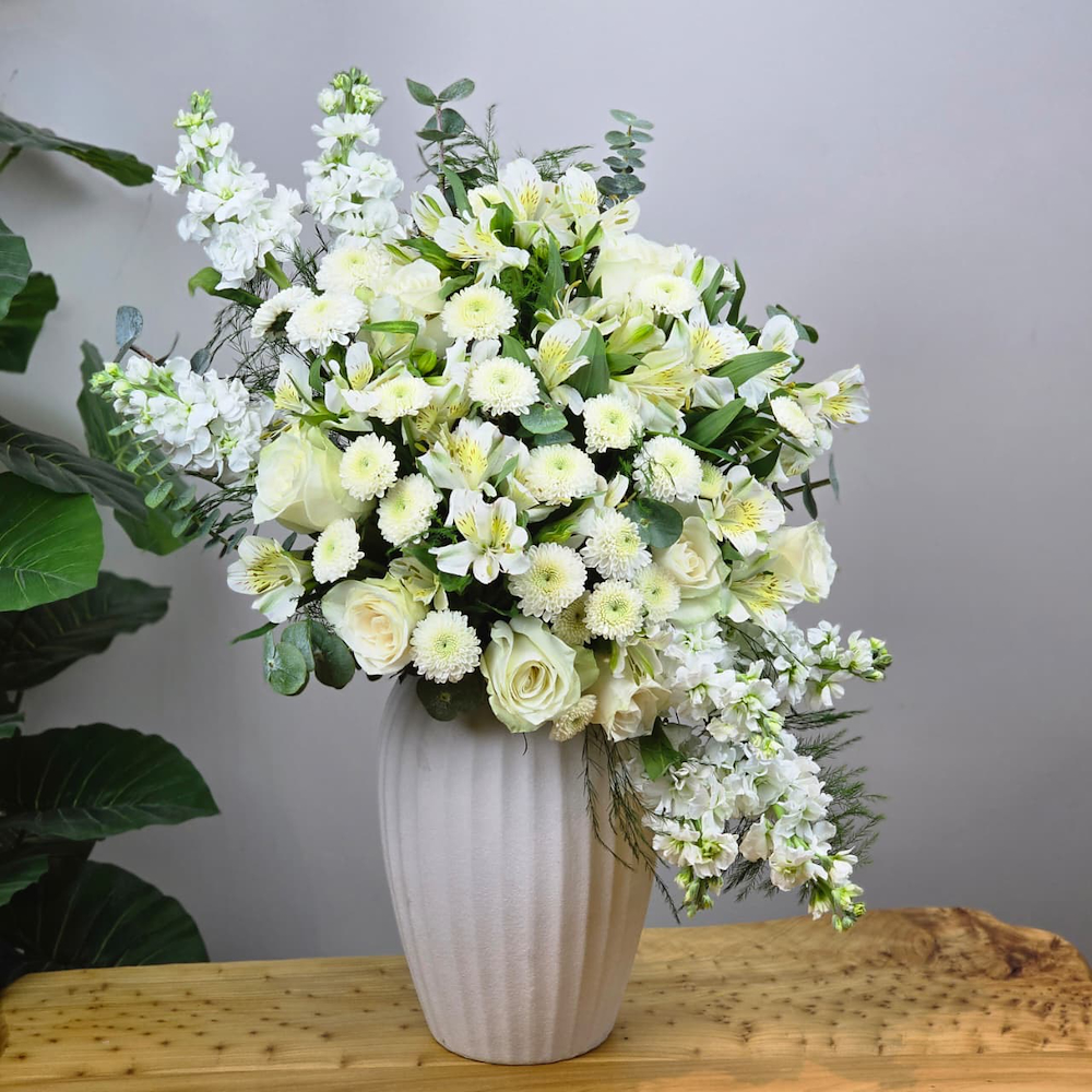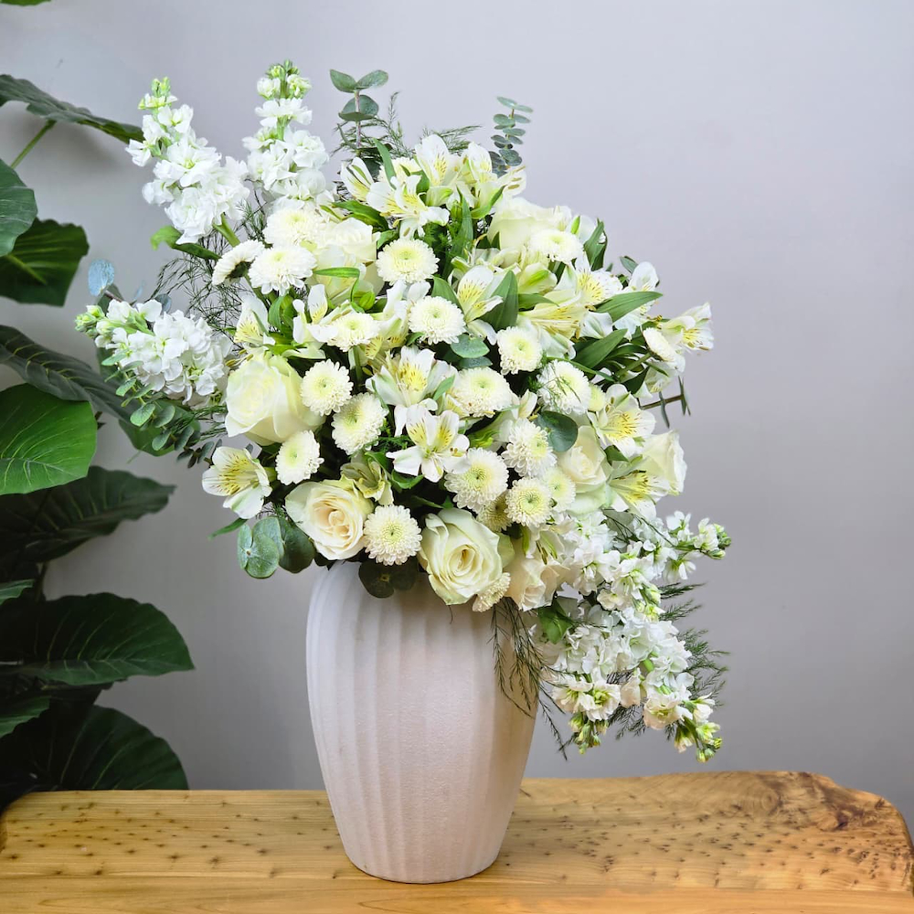 A vase filled with roses, chrysanthemums, matthiolas and alstroemerias.