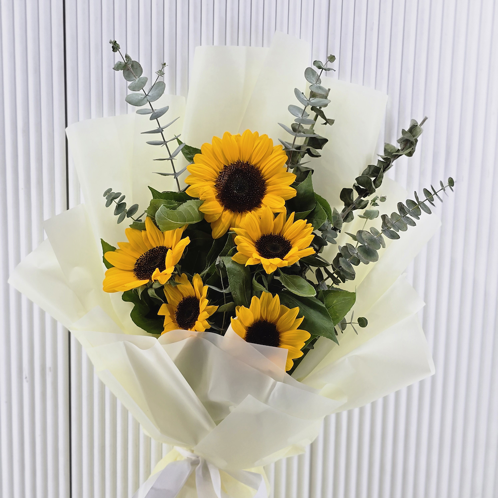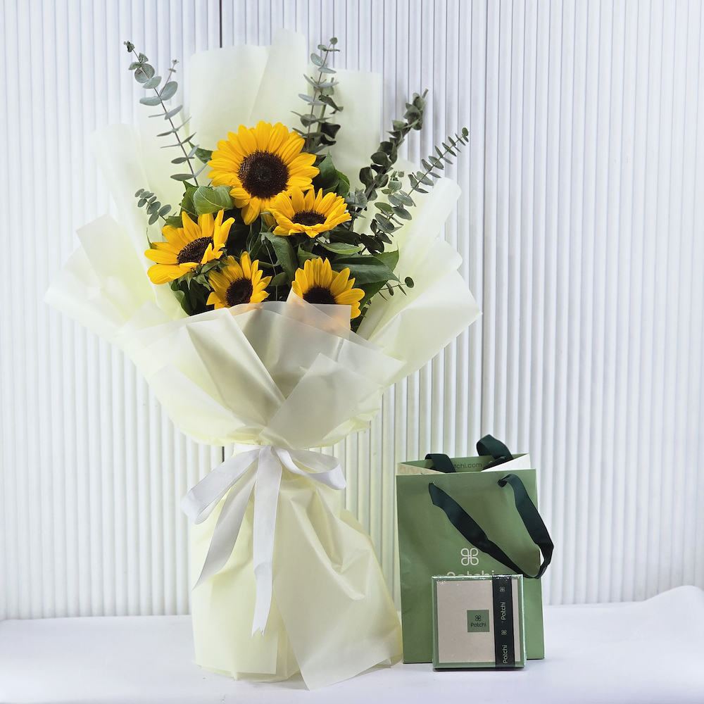 A hand bouquet of sunflowers with 9 pieces of chocolate from Patchi.