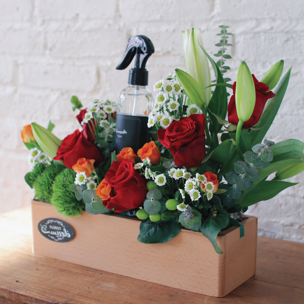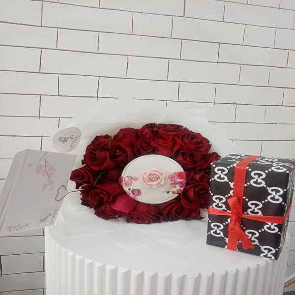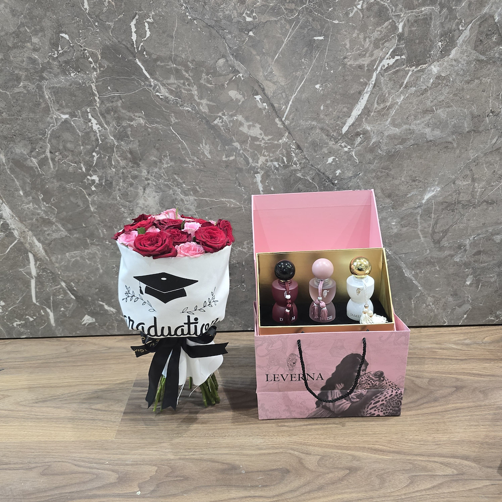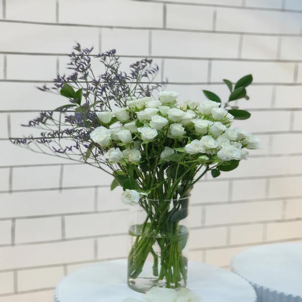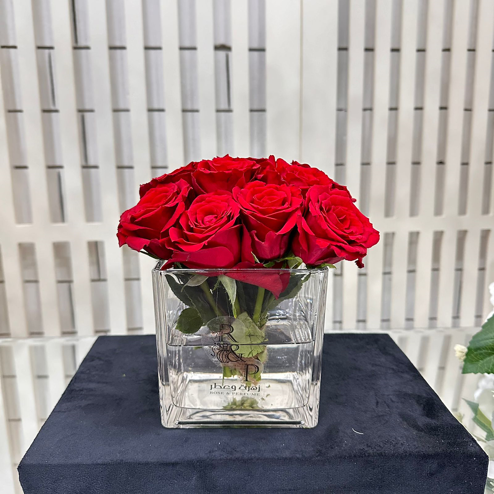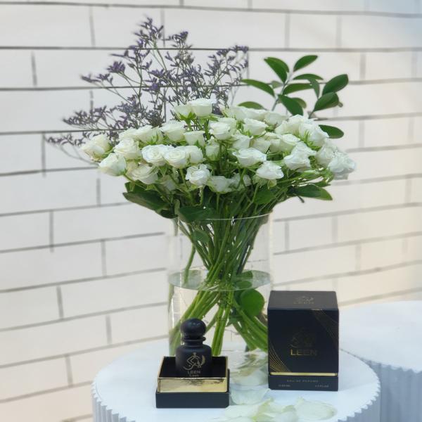 A cylindrical vase of baby roses flowers with Leen perfume.