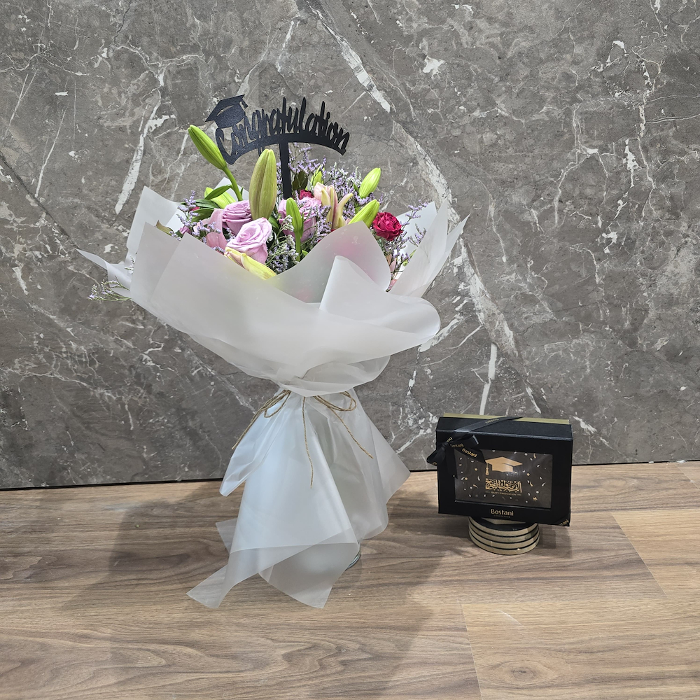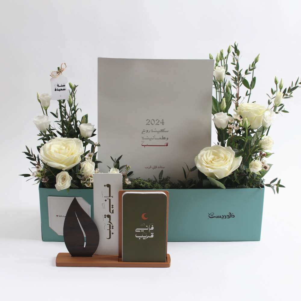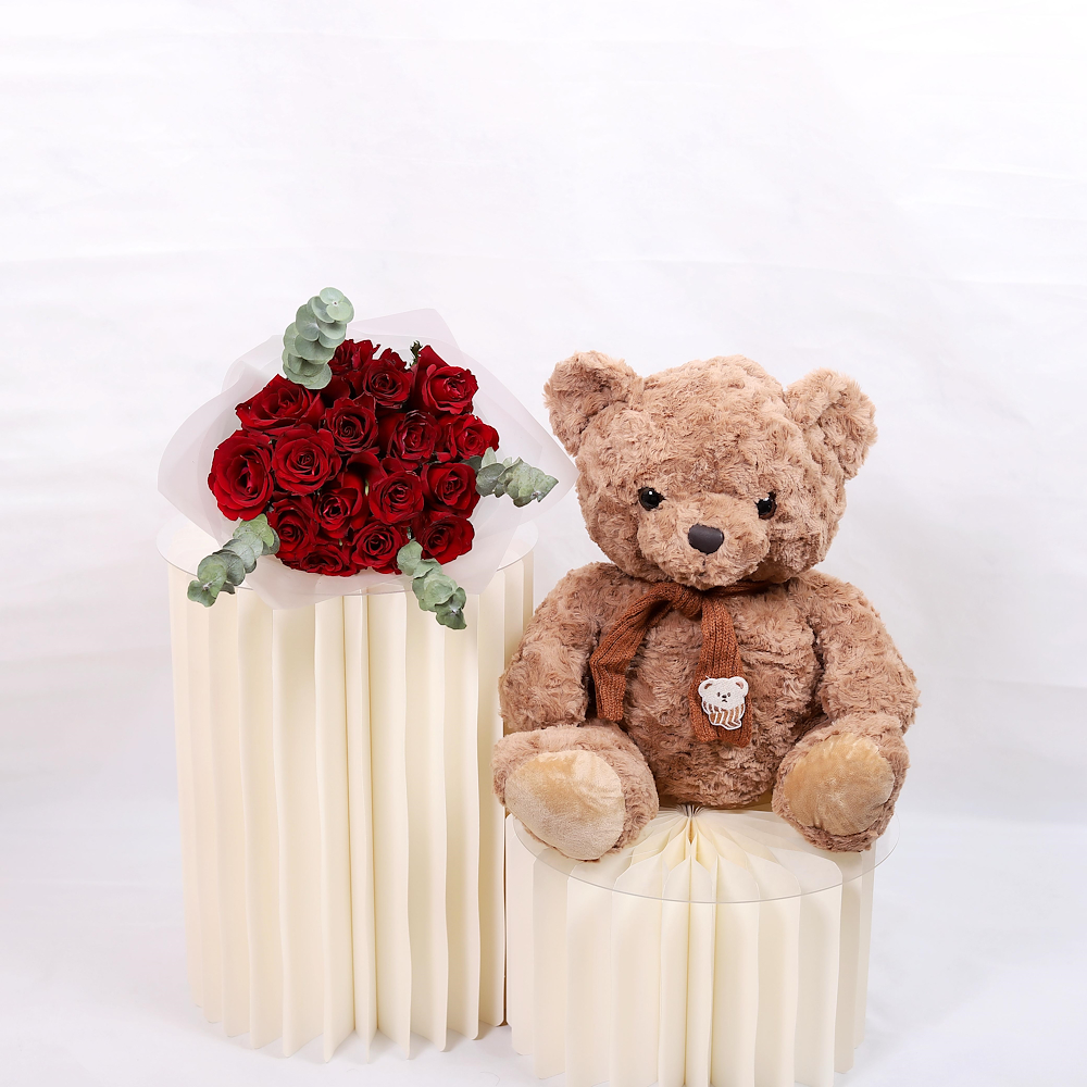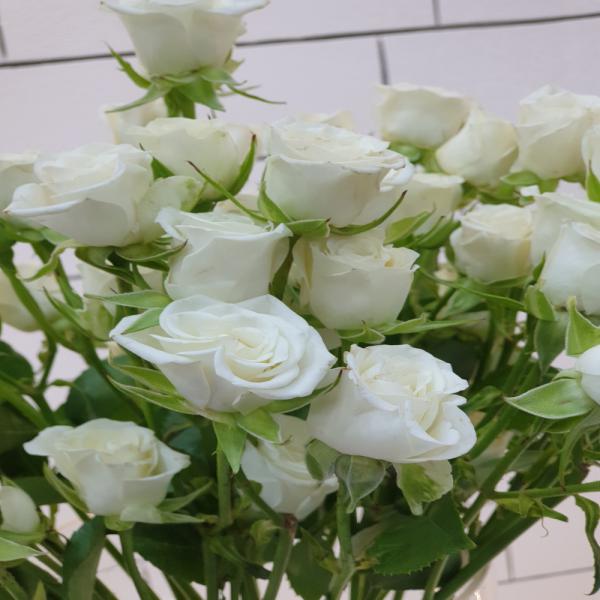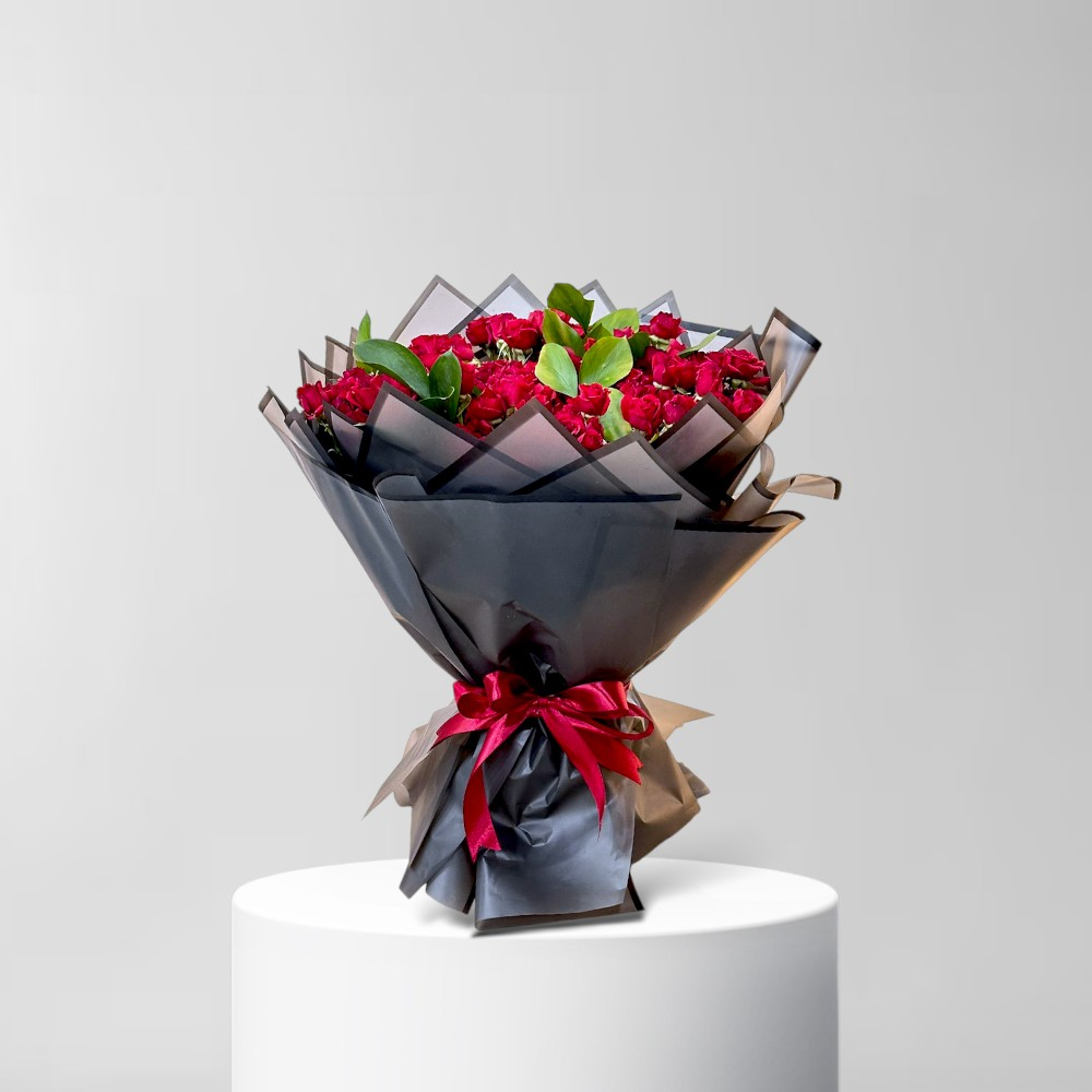 A cylindrical vase of baby roses flowers with Leen perfume.
